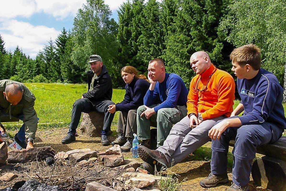 Gruppe sitzt auf Baumstämmen in der Natur, umgeben von Bäumen und Wiese