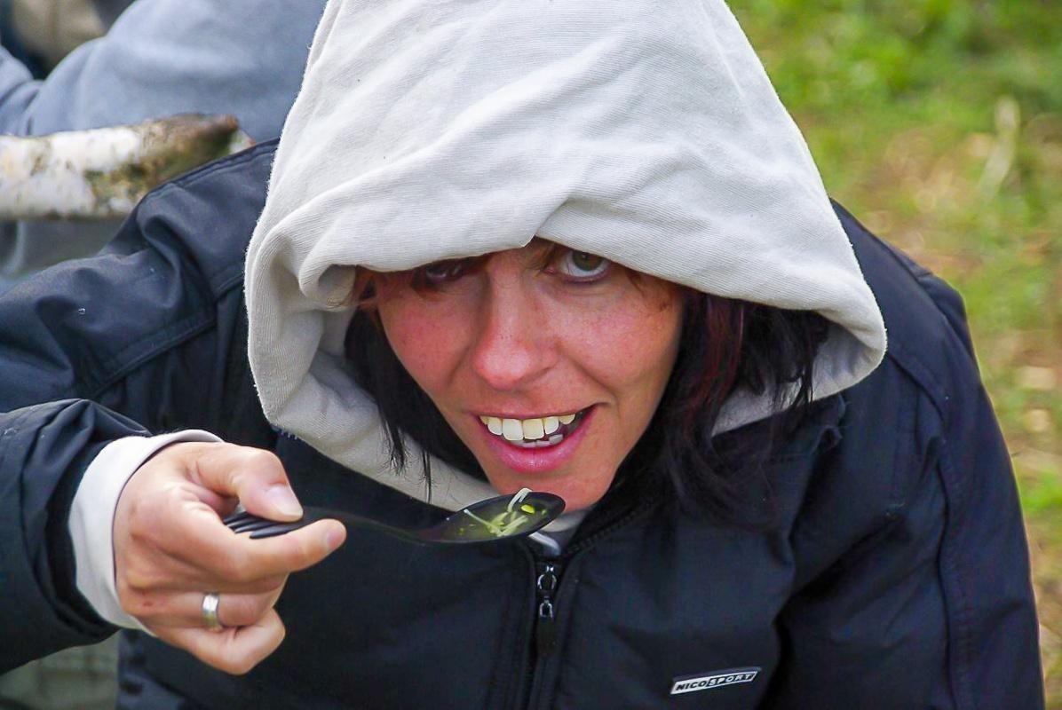Gruppe um ein Feuer mit einem Kessel auf einem improvisierten Gestell aus Ästen
