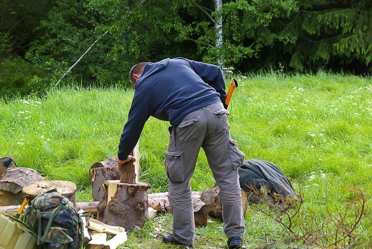 Mann bearbeitet Holzstücke mit einer Axt in einer grünen Wiese