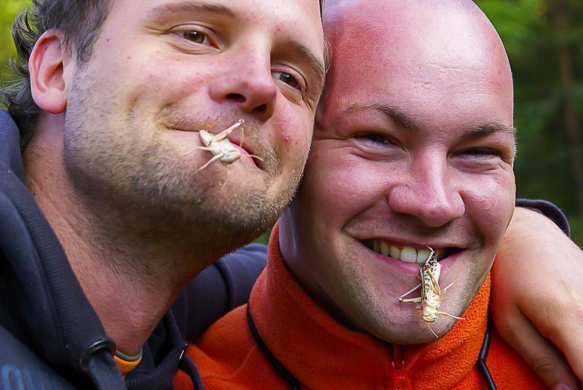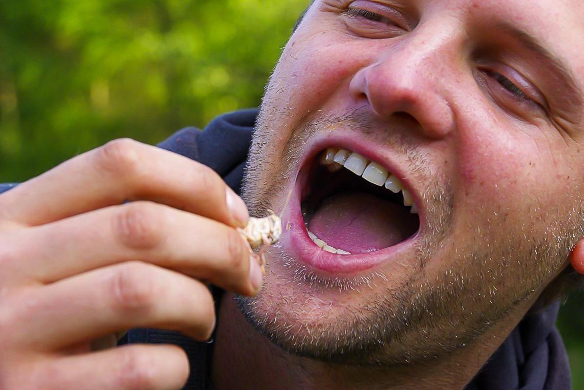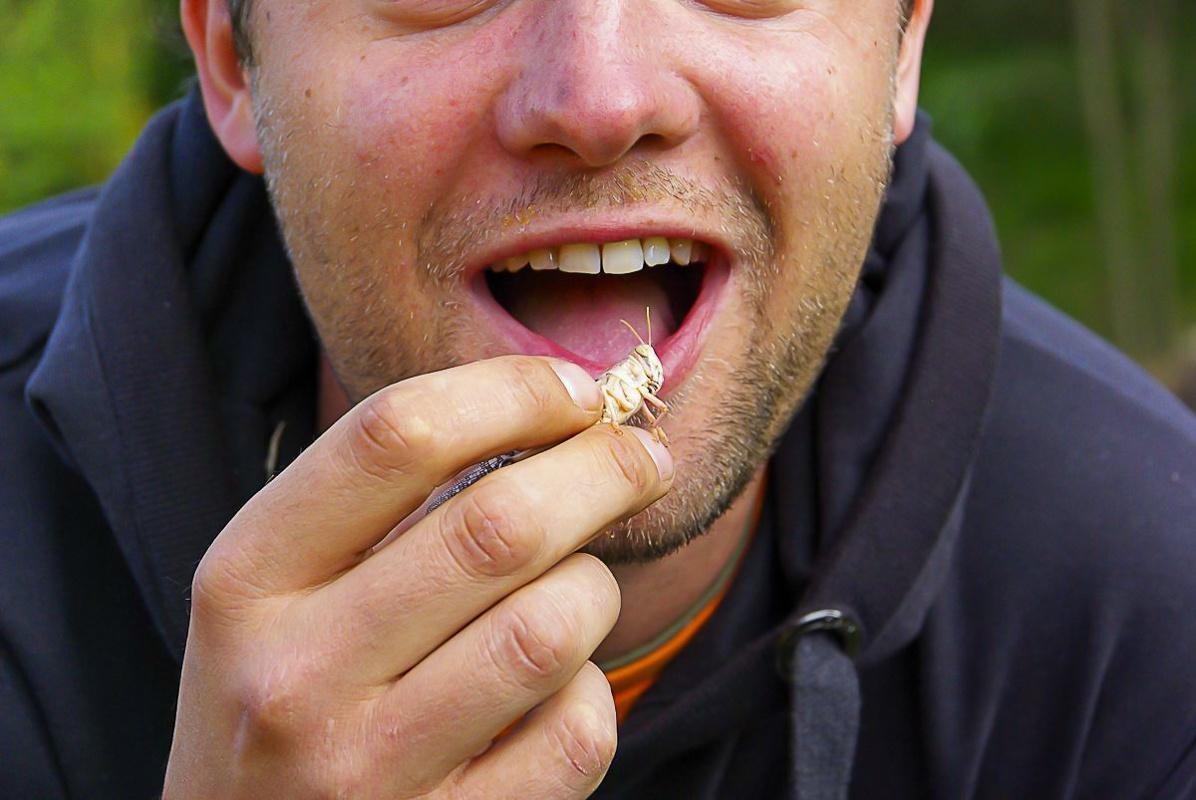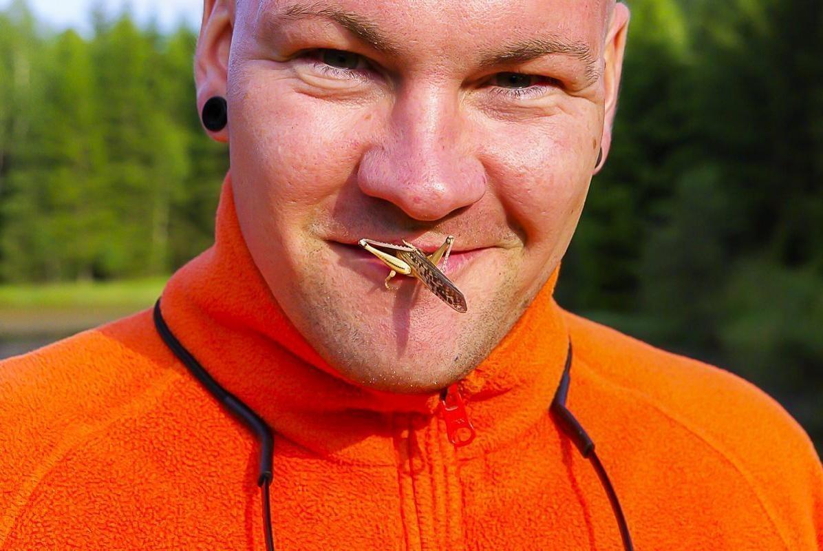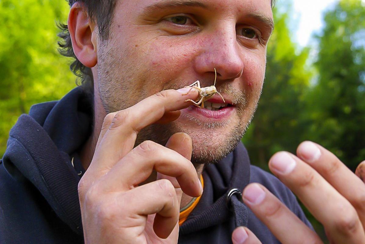 Mann hält eine Heuschrecke vor den Mund und lächelt