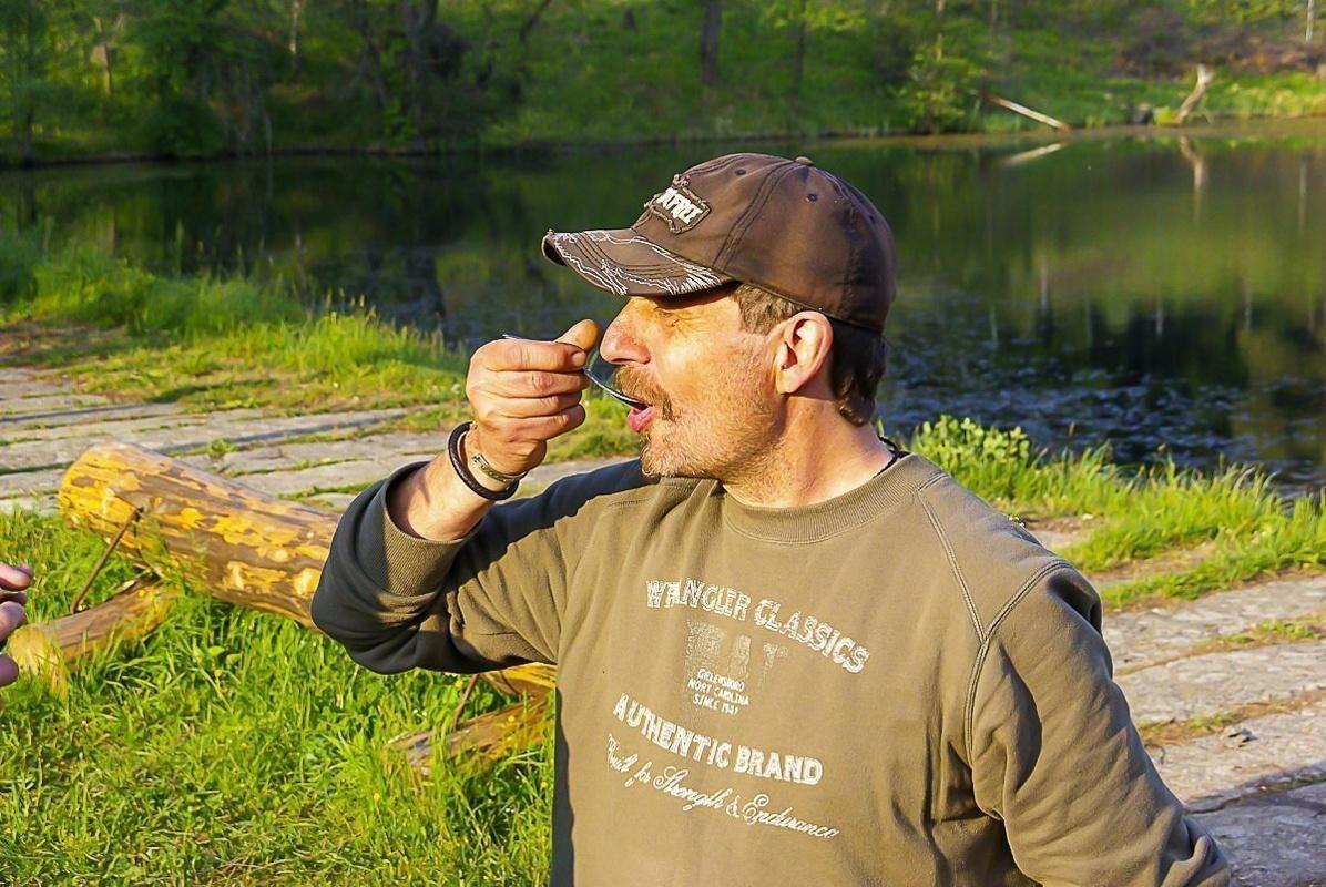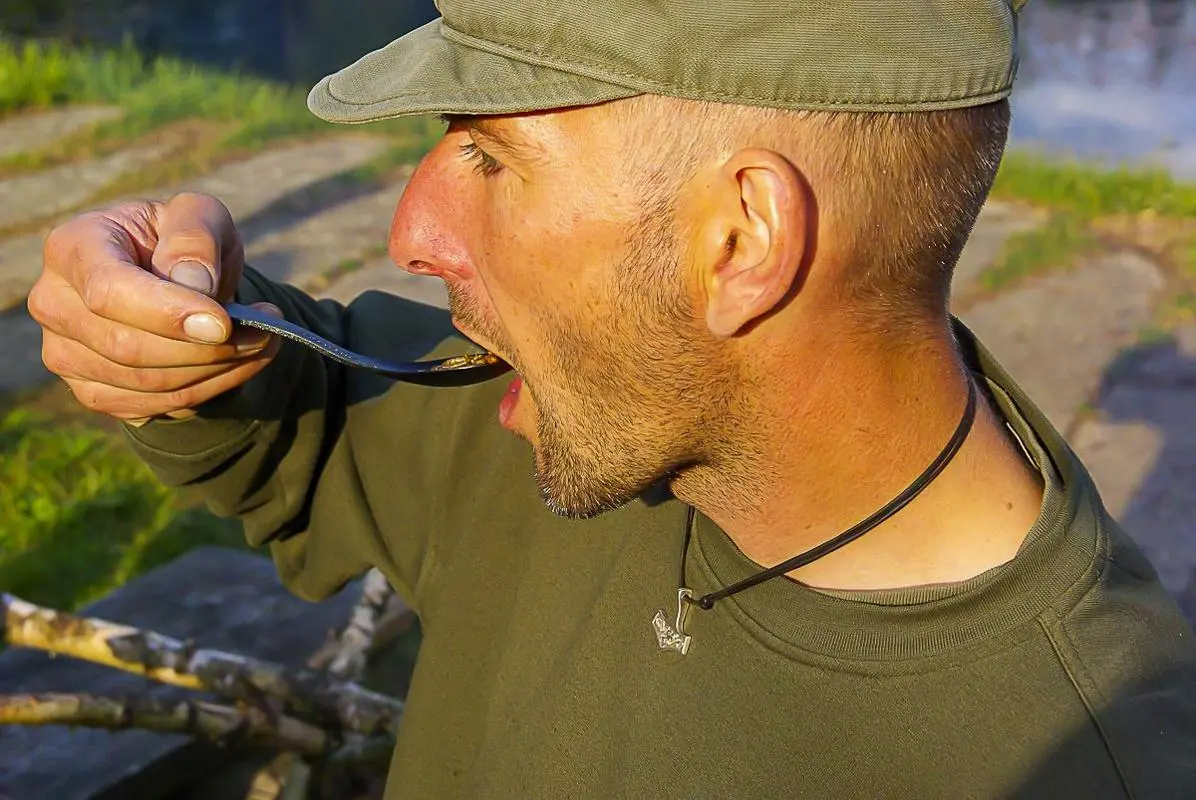 Mann hält einen Löffel an den Mund am Ufer eines Gewässers