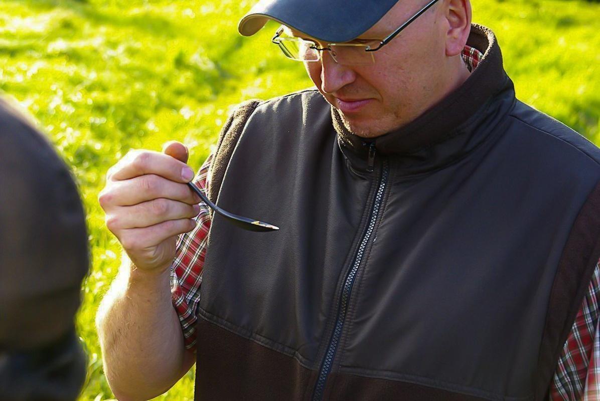 Mann hält einen Löffel und betrachtet dessen Inhalt aufmerksam