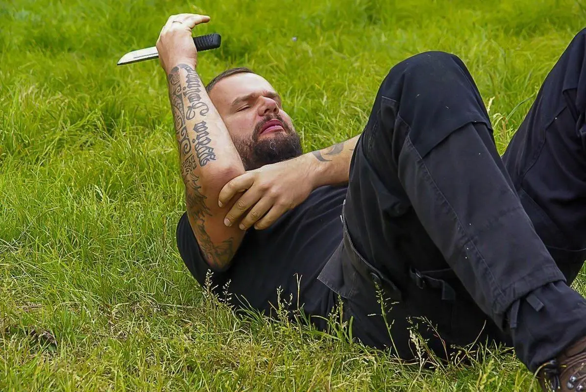 Mann liegt auf Gras und hält ein Messer in der Hand