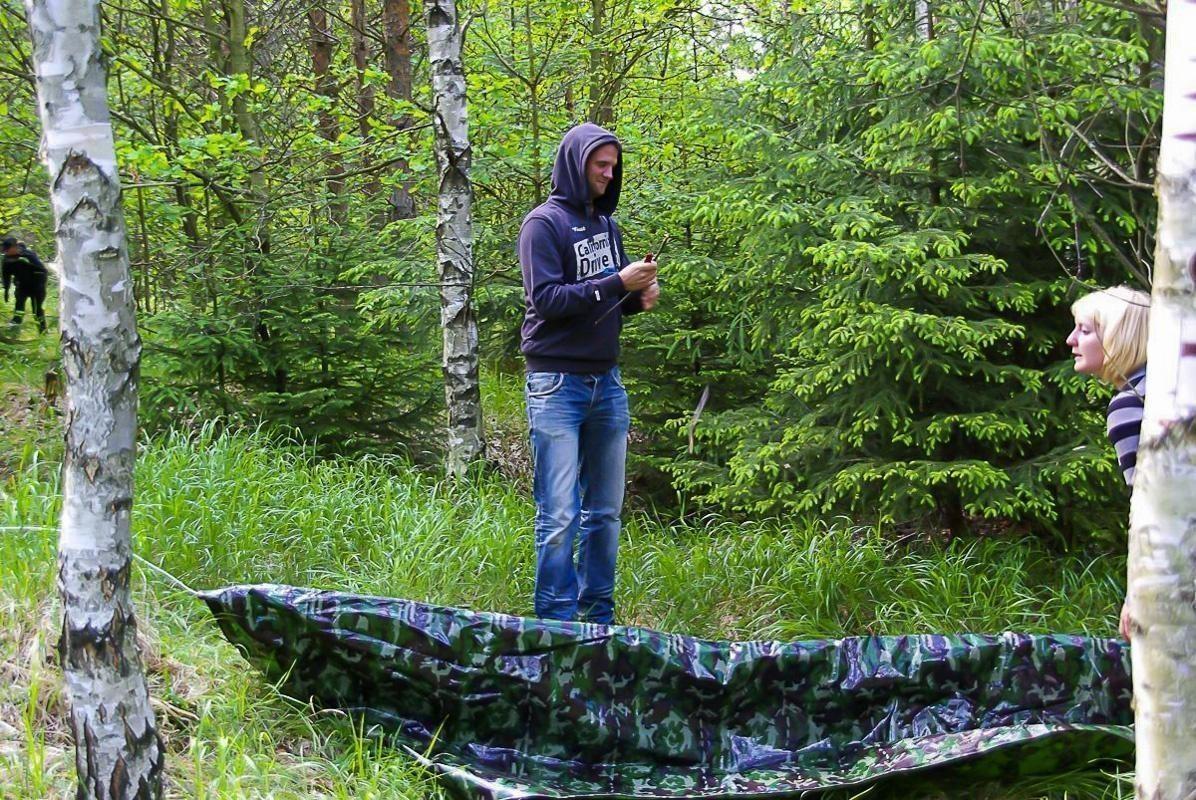 Mann mit Kapuze hält ein Seil neben einer Tarp-Notunterkunft im Wald