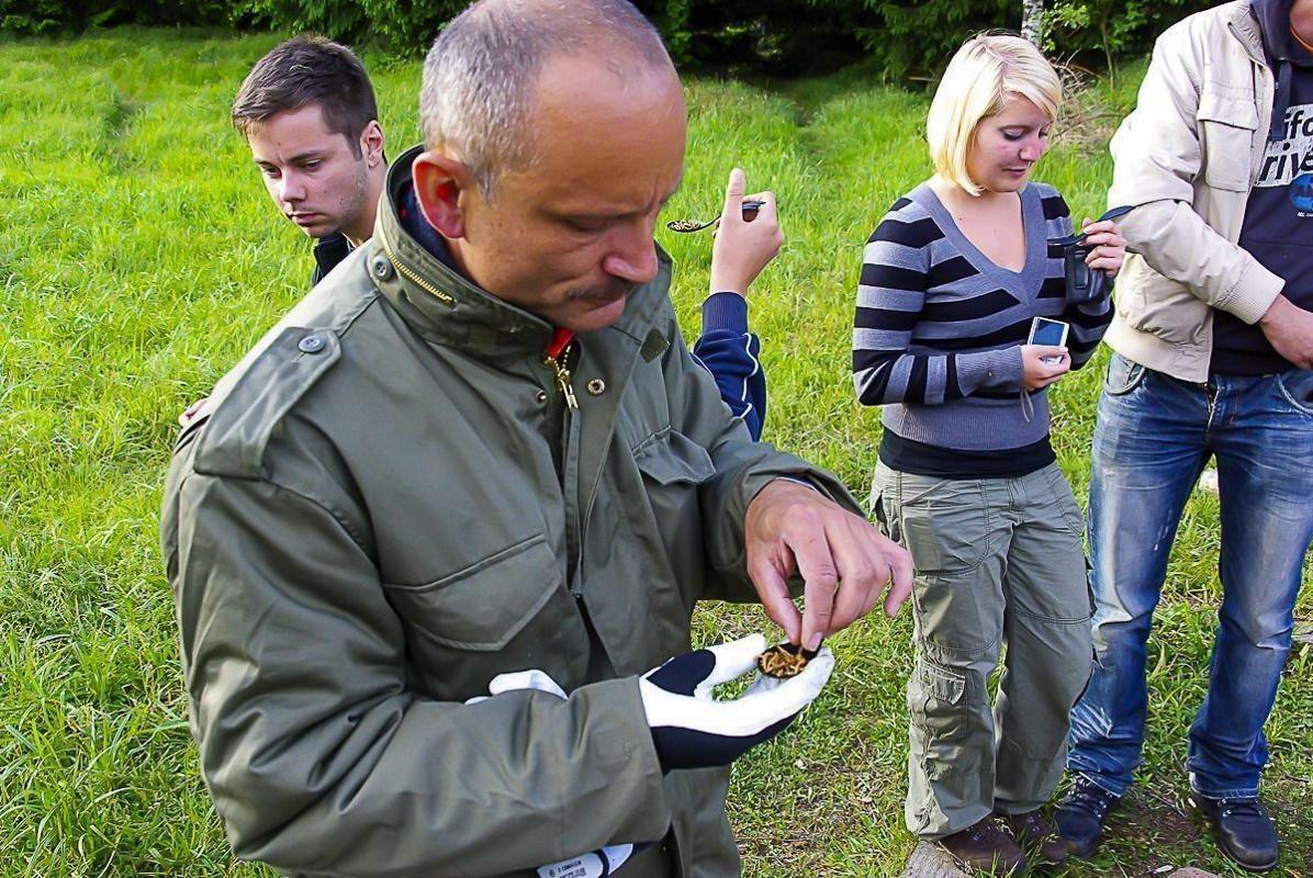 Mann mit orangefarbener Jacke hält eine Heuschrecke vor dem Mund