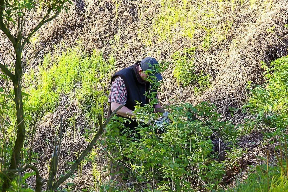 Person bearbeitet Pflanzen in einem dichten, grünen Unterholz