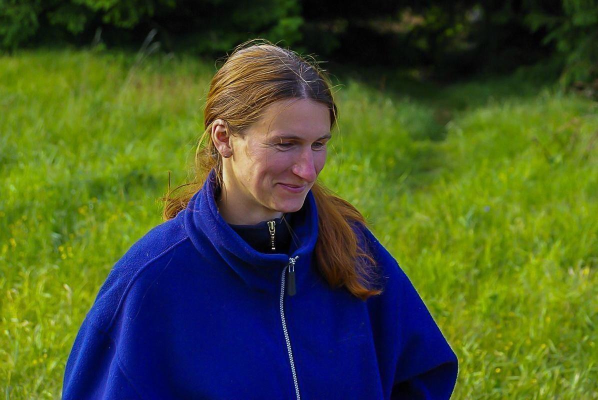 Zwei Personen stehen in einer grünen Wiese und scheinen zu kommunizieren