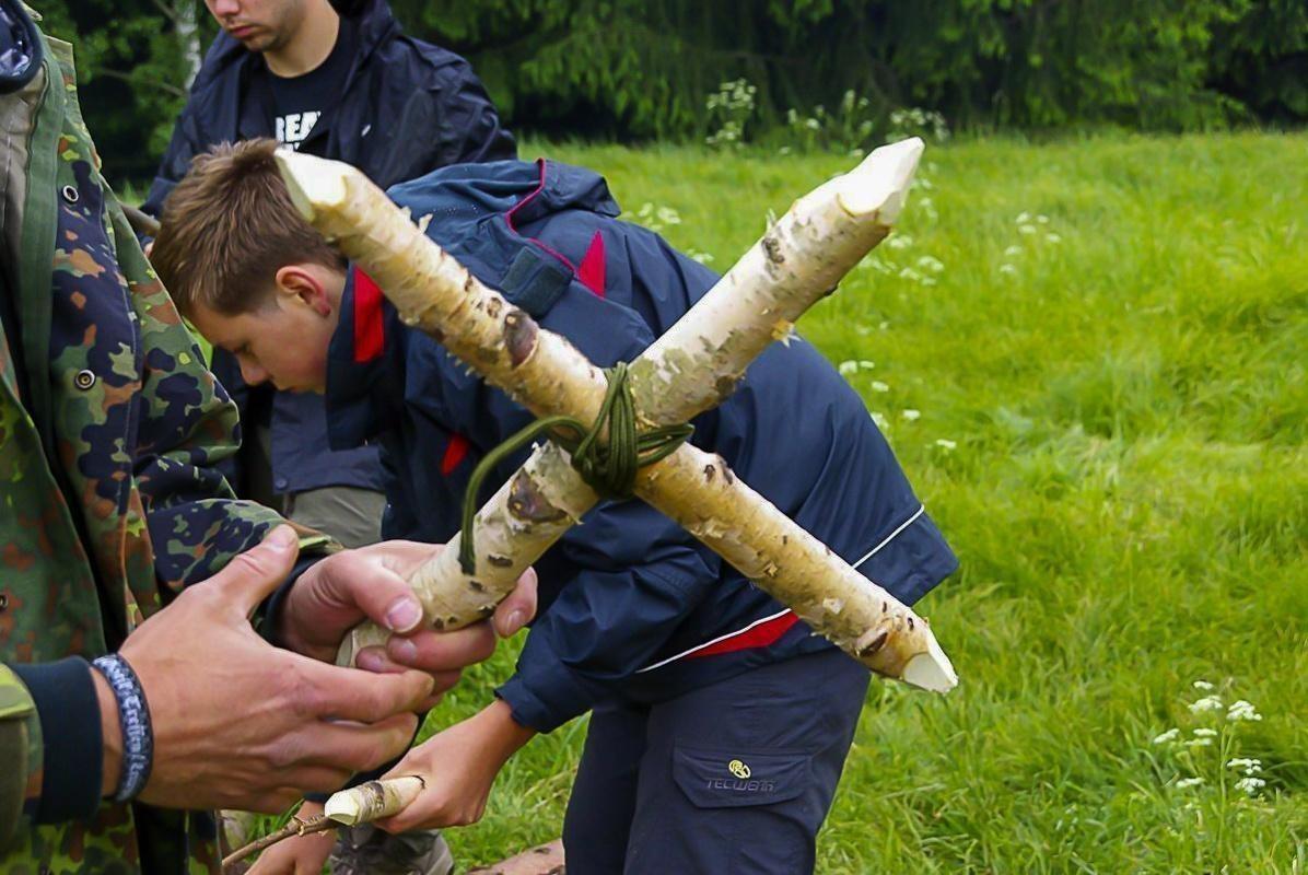 Selbstgebaute Konstruktion aus Ästen wird mit Schnur verbunden