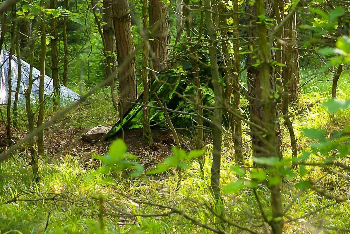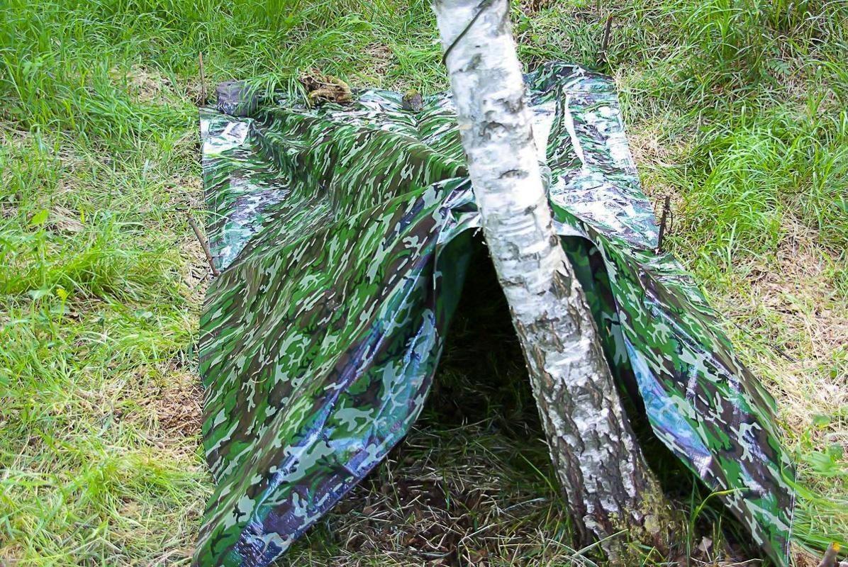 Tarp-Notunterkunft zwischen Bäumen, umgeben von Gras und Sträuchern
