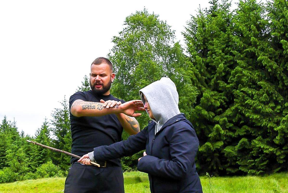 Training mit einem Stock zur Selbstverteidigung im Freien