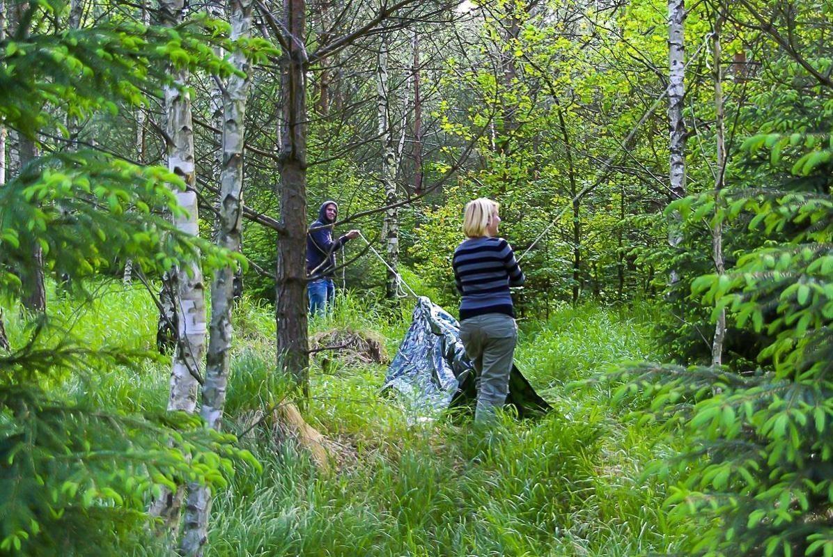 Zwei Personen bauen eine Tarp-Notunterkunft im Wald auf