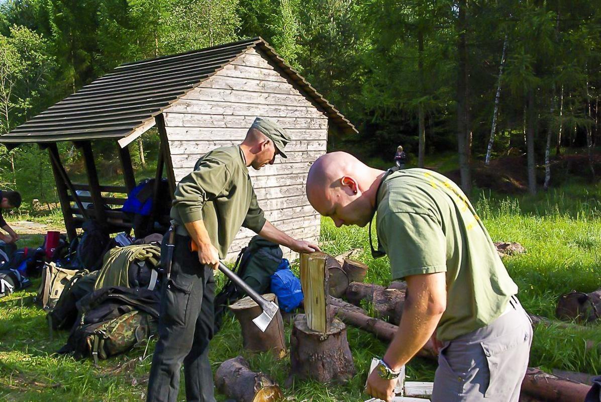 Gruppe steht um eine Holzbank, auf der Ausrüstung und Holzstücke liegen