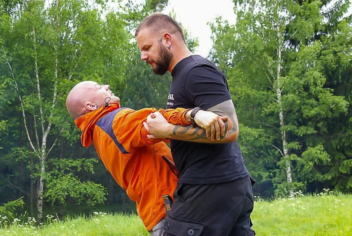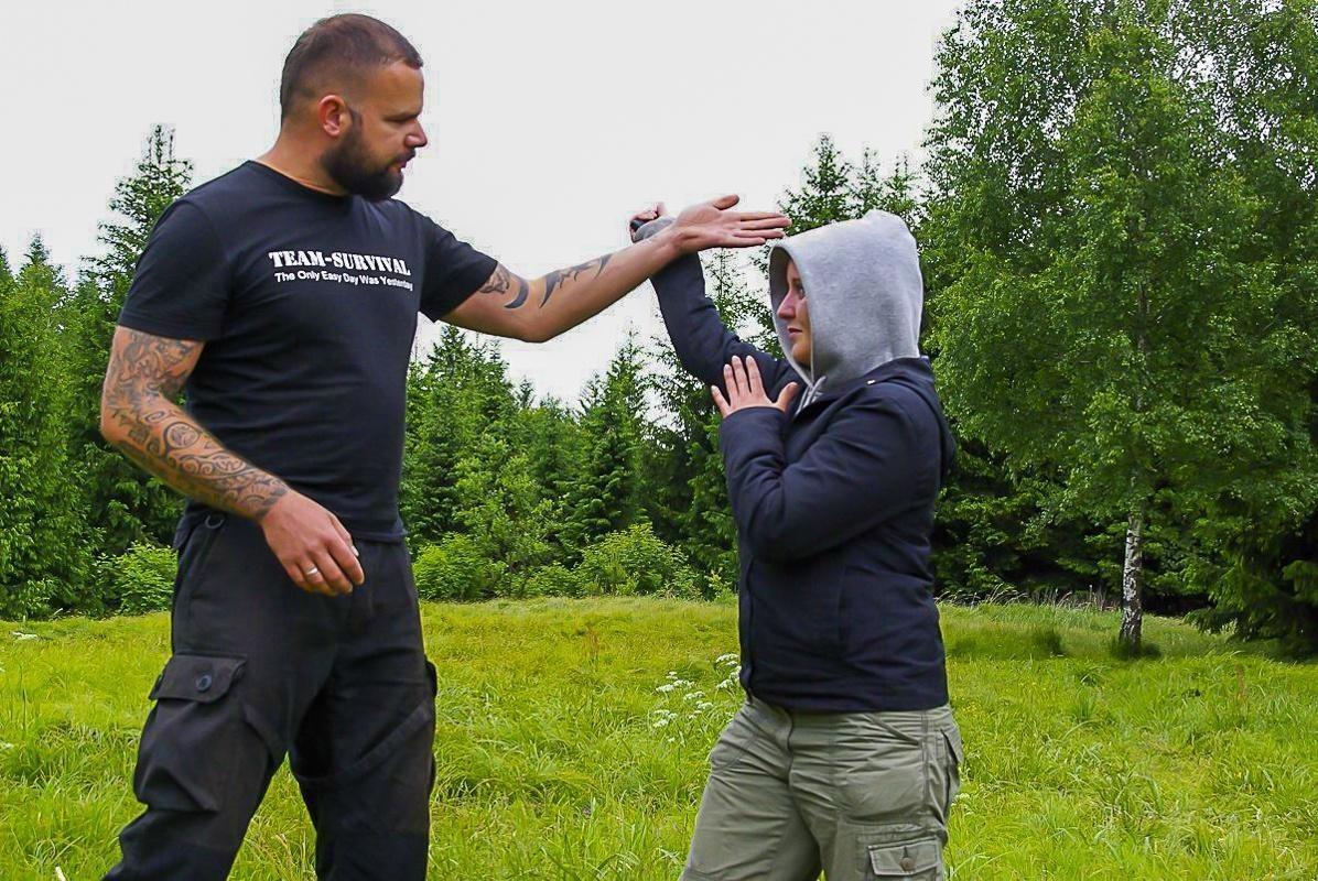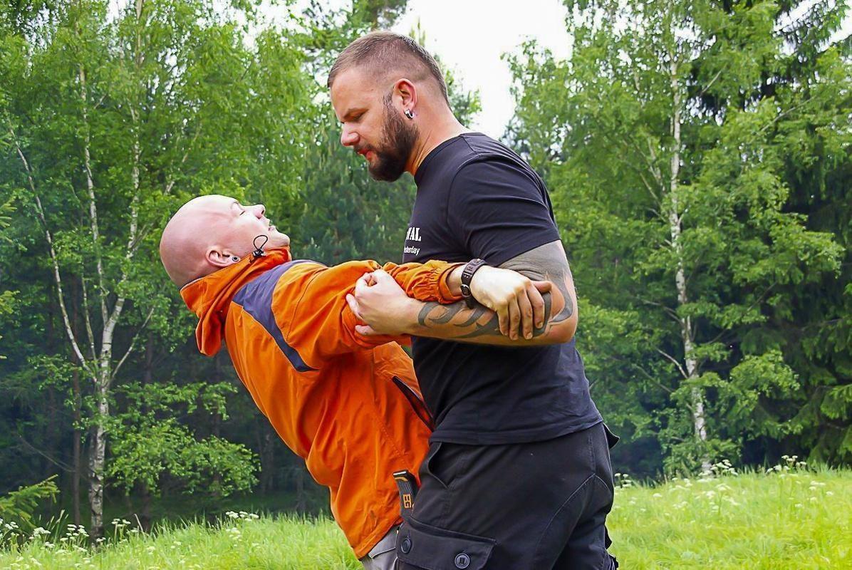 Zwei Personen üben eine Selbstverteidigungstechnik in einer grünen Wiese