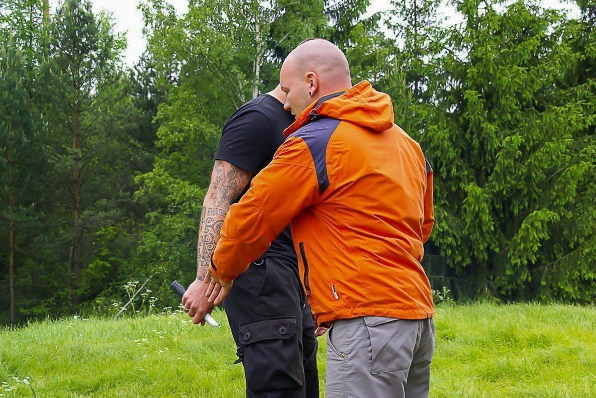 Training zur Selbstverteidigung mit einer Person und einer Waffe im Freien