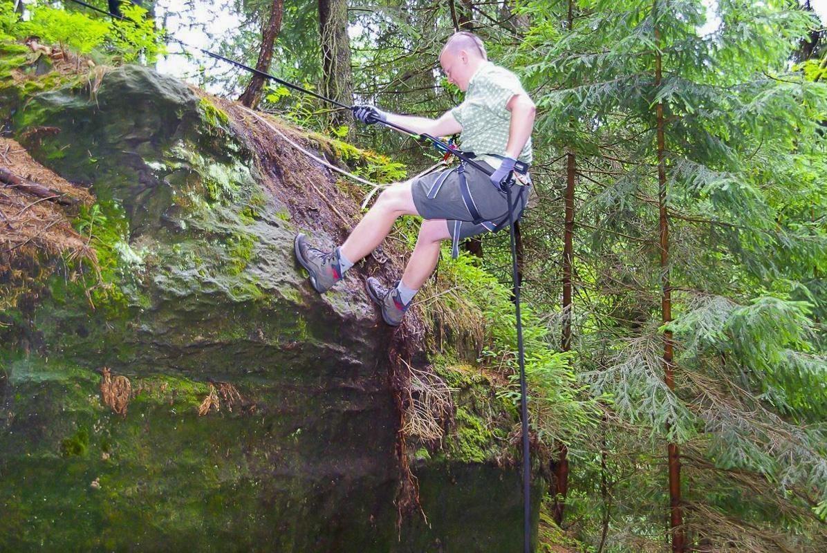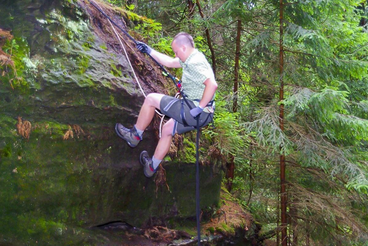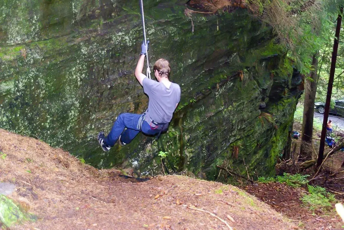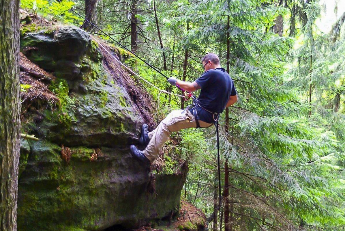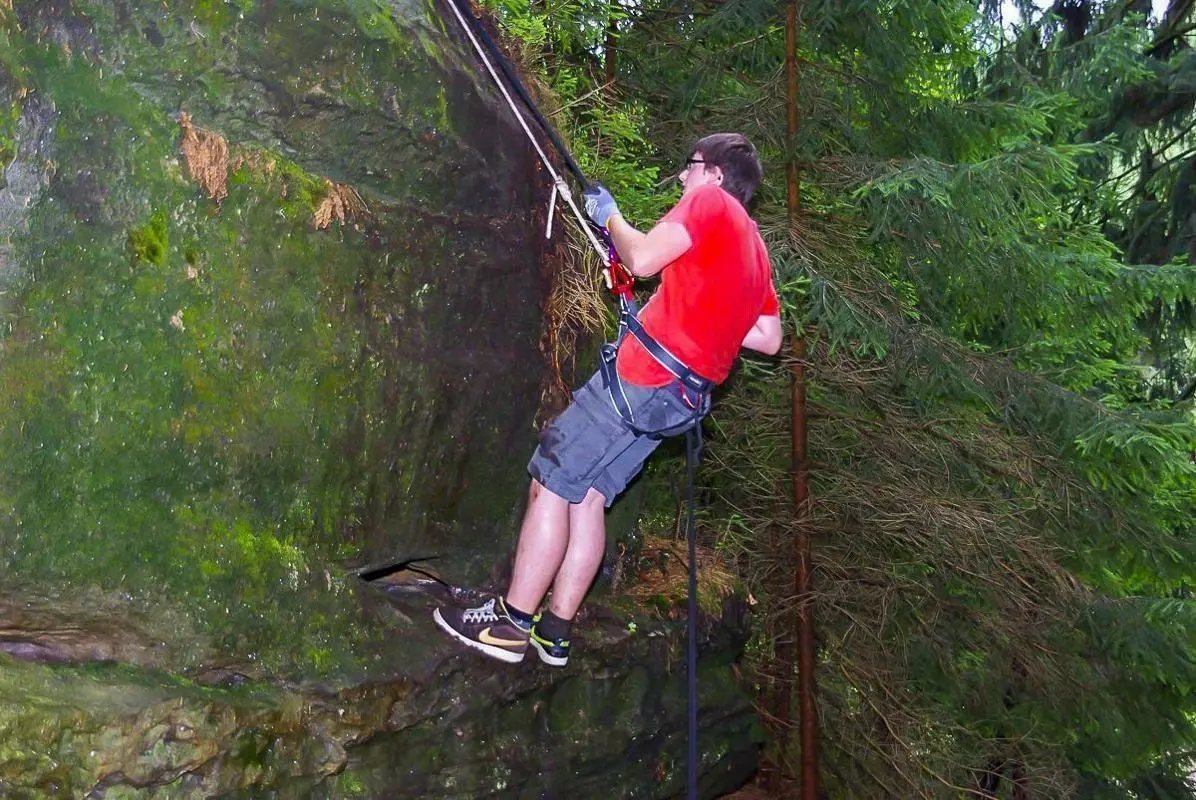 Abseilen an einer Felswand mit Seil und Sicherungshaken im Wald