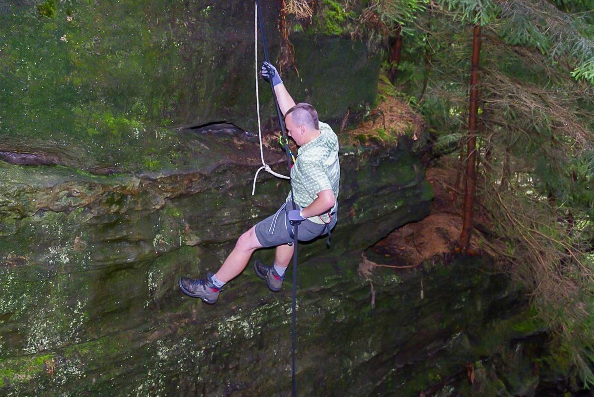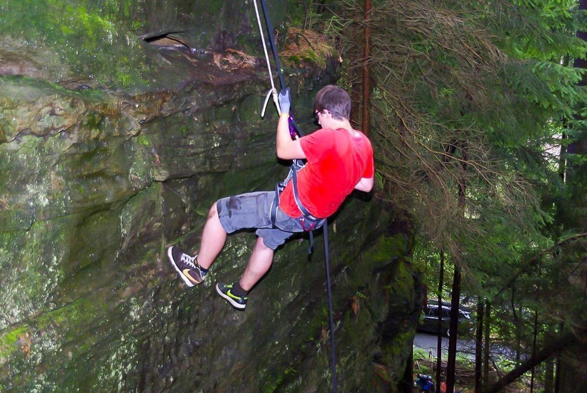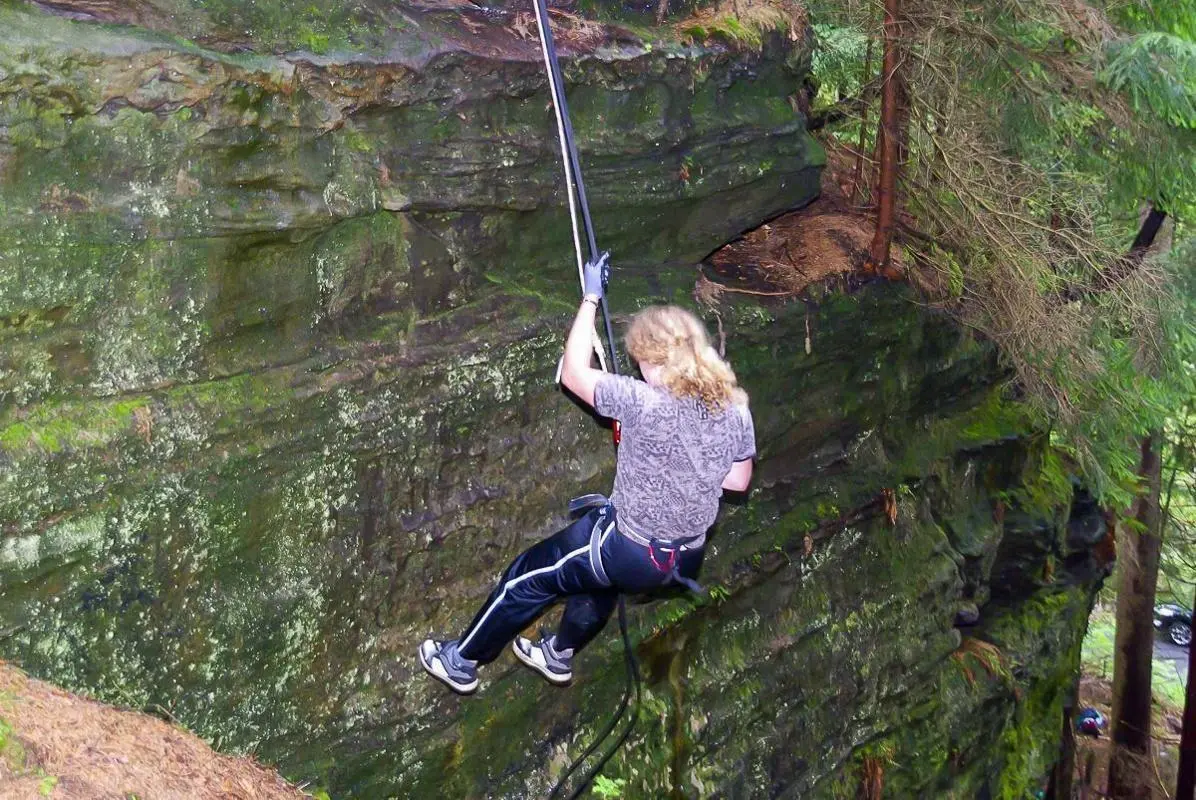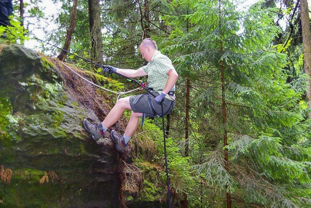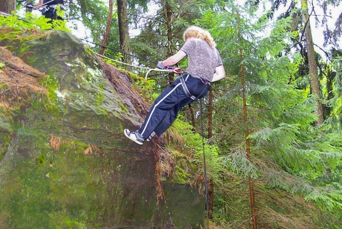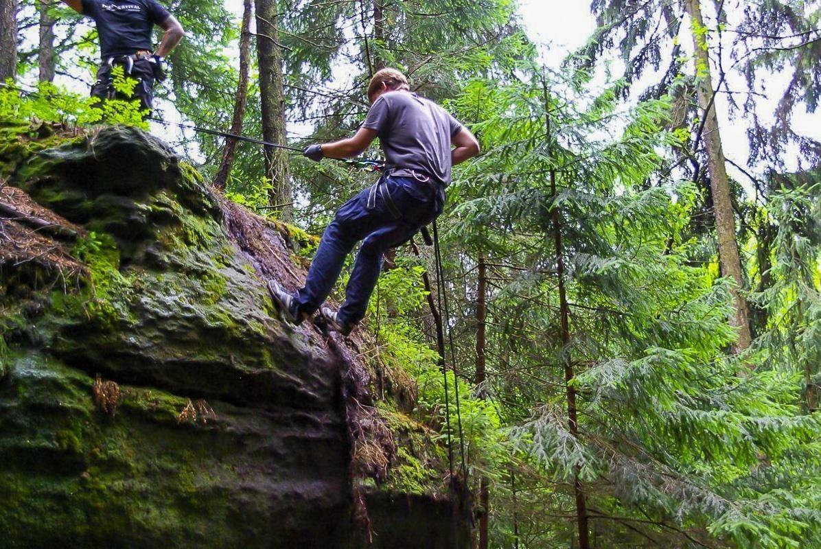 Abseilen an einer Felswand mit Seil und Sicherungshaken im Wald