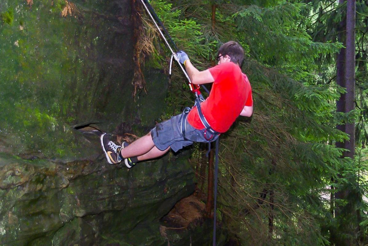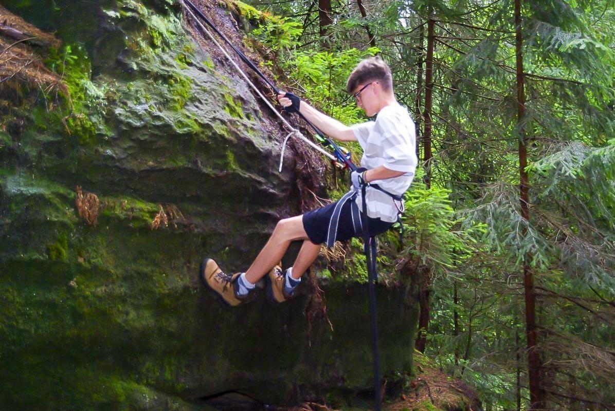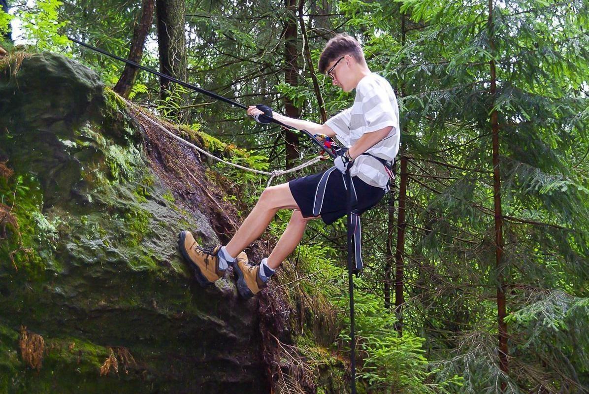 Junge seilt sich an einem Felsvorsprung mit Sicherungsseil ab