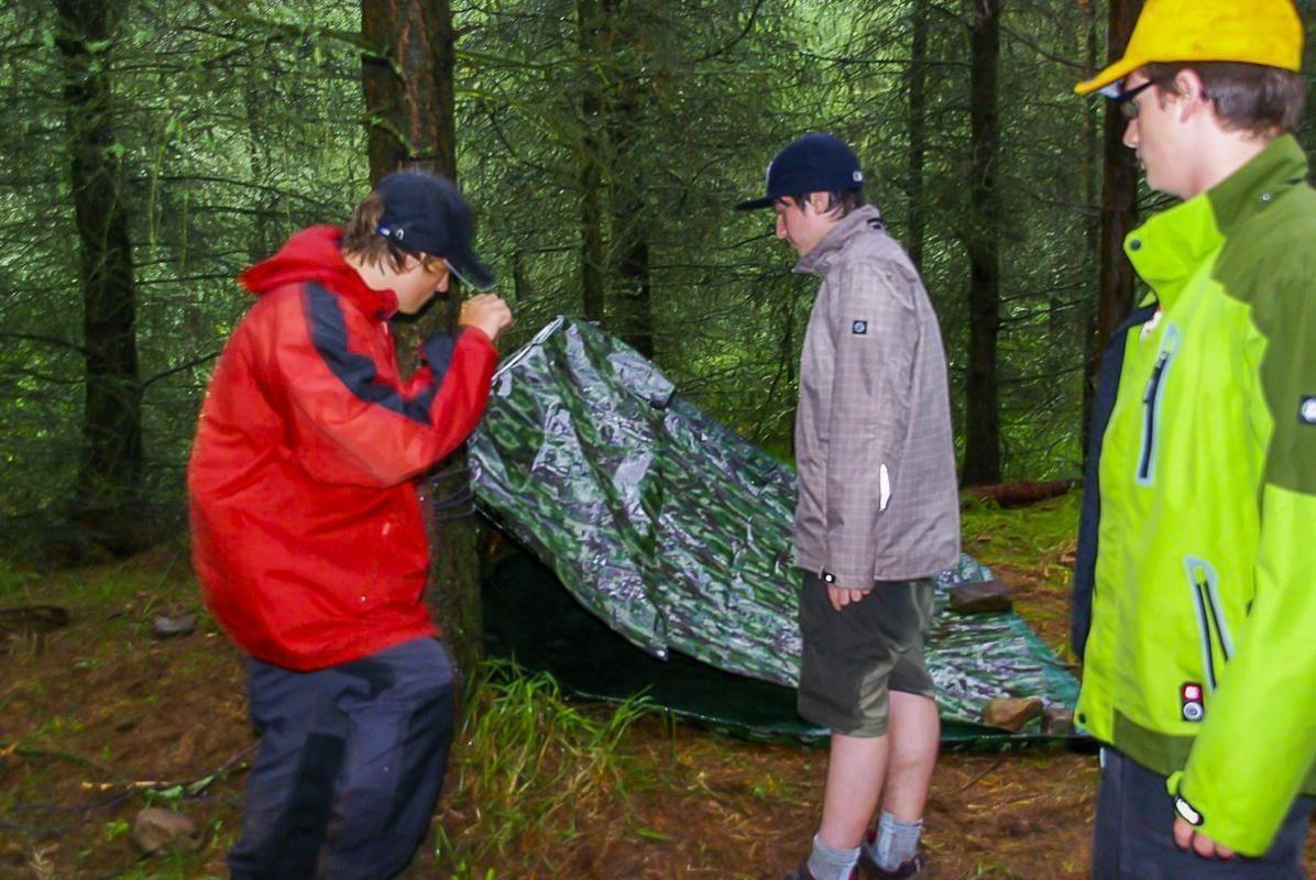 Drei Personen bauen eine Tarp-Notunterkunft im Wald auf