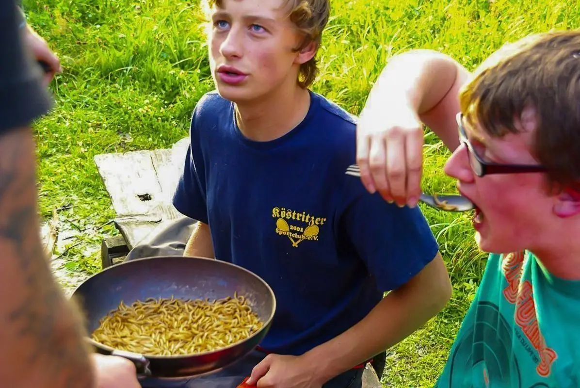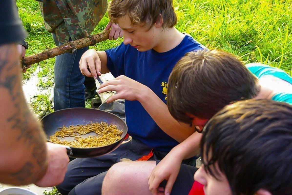 Ein Junge entnimmt Insekten aus einer Pfanne, während andere zuschauen
