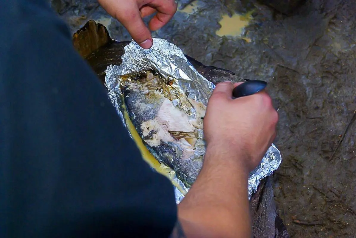 Fisch wird in Alufolie auf einem Holzstück zubereitet