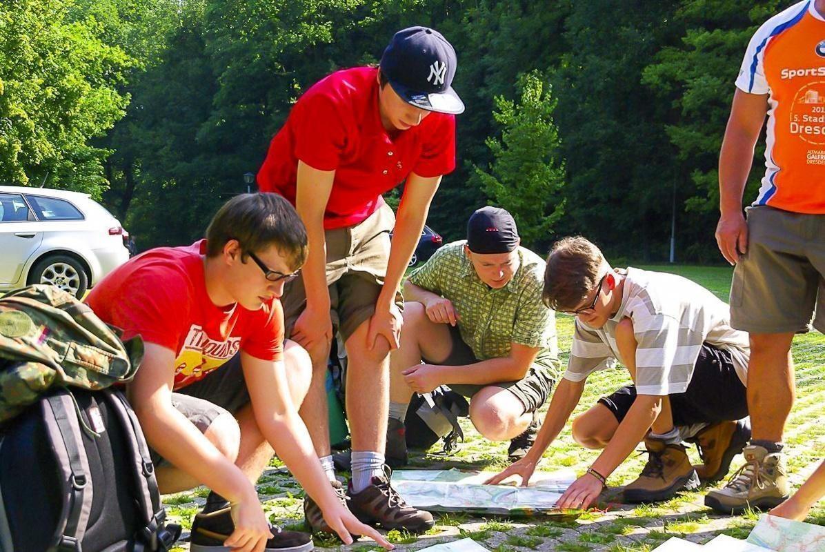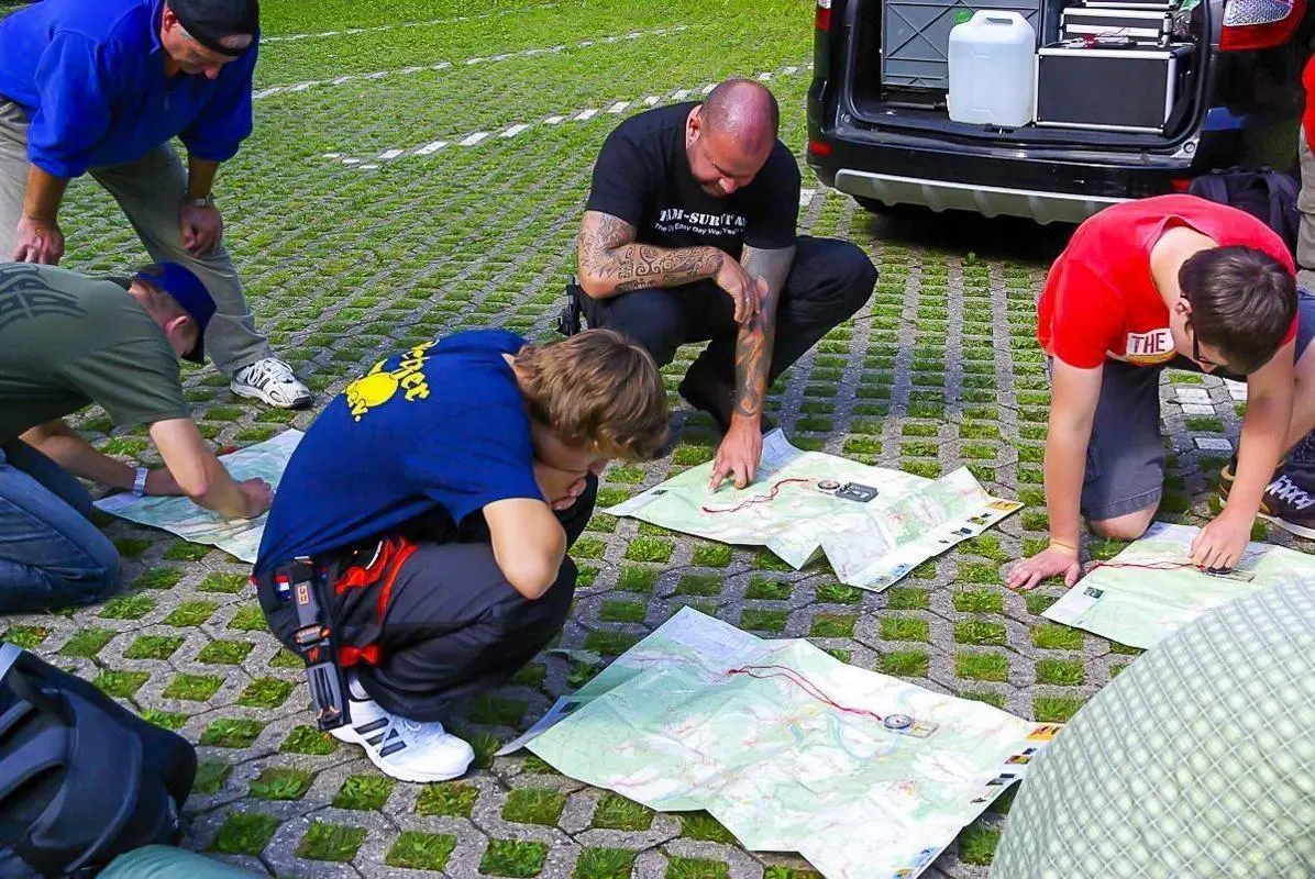 Gruppenteilnehmer analysieren Karten auf dem Boden, einige nutzen Kompasse zur Orientierung