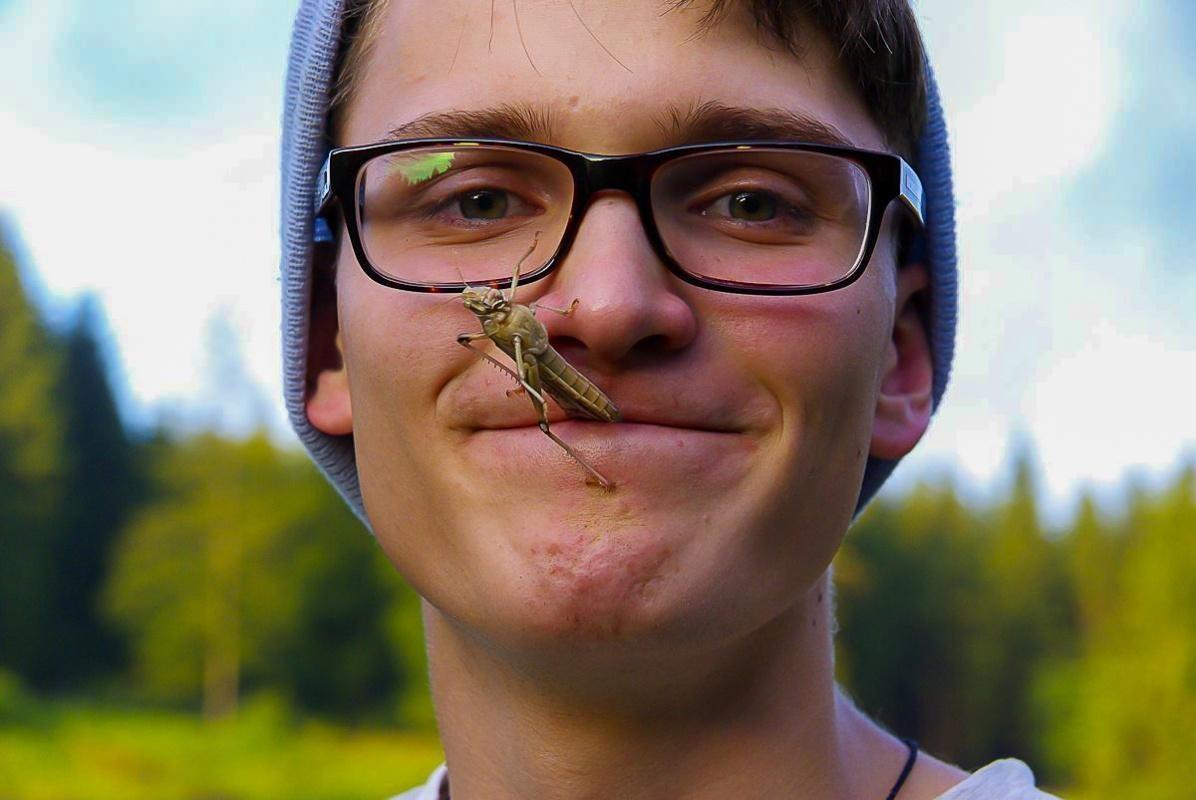 Grashüpfer sitzt auf der Oberlippe eines lächelnden jungen Mannes