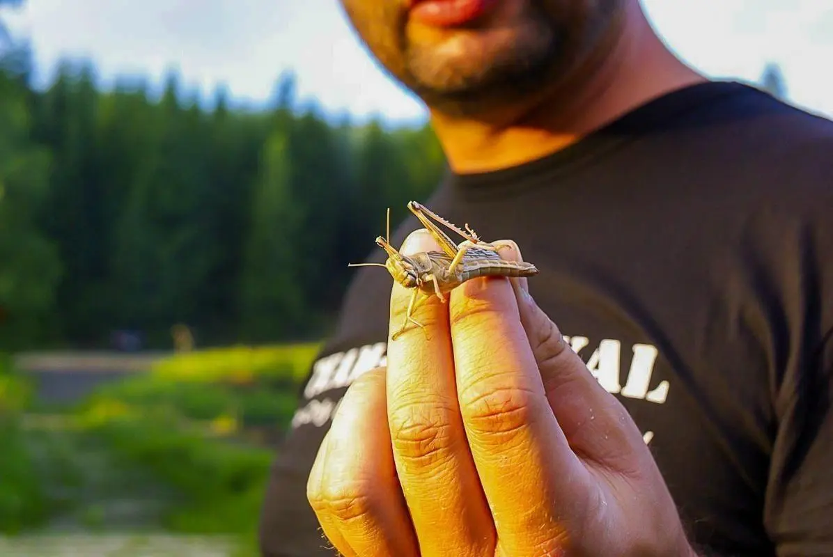 Grashüpfer wird zwischen Daumen und Zeigefinger gehalten