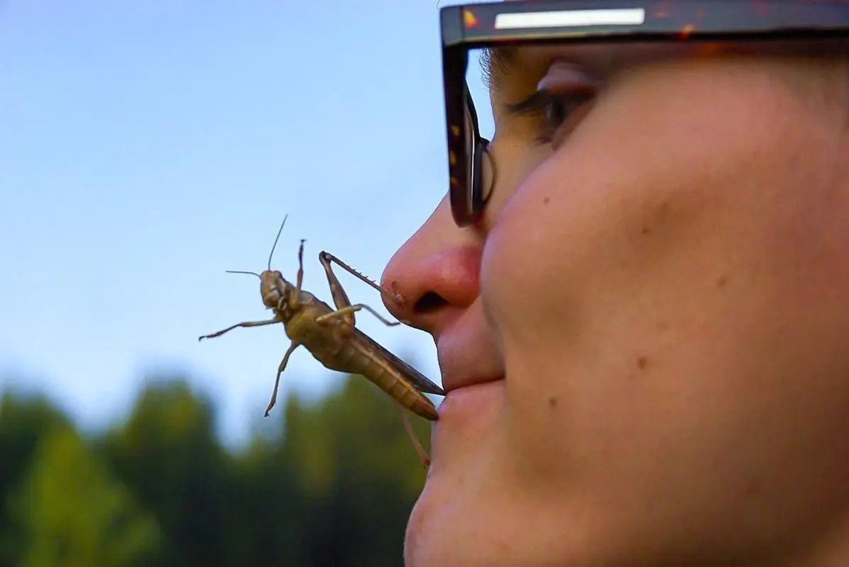 Mann hält ein Insekt mit den Lippen und schaut konzentriert
