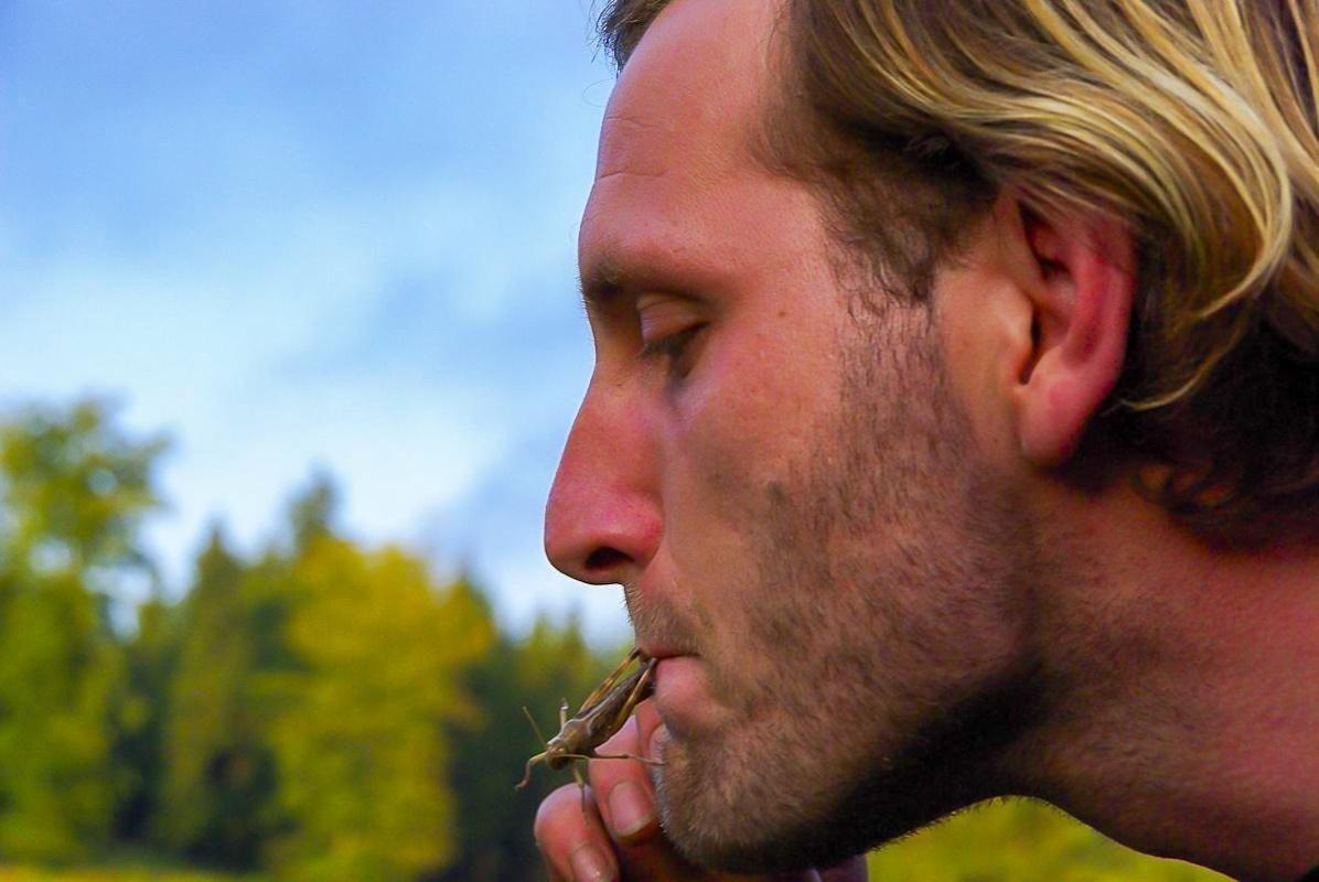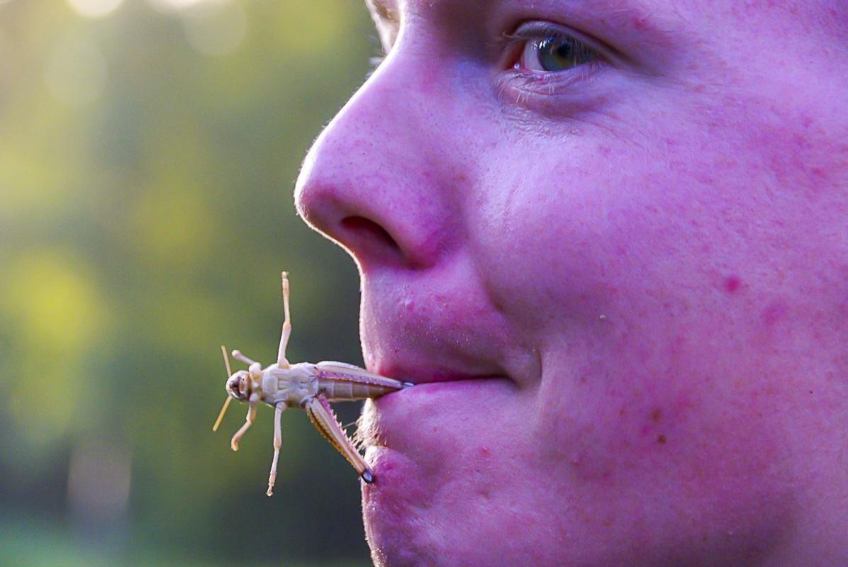Männliche Person mit einer Heuschrecke im Mundbereich