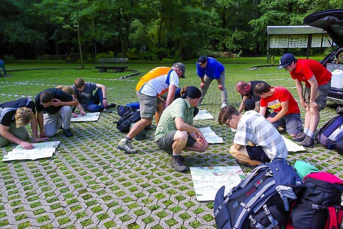 Gruppe betrachtet Karten auf dem Boden, Rucksäcke liegen daneben