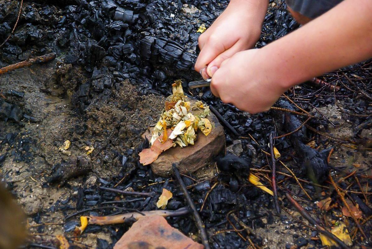 Zunder wird auf einem Stein vorbereitet, während Holzstücke daneben liegen