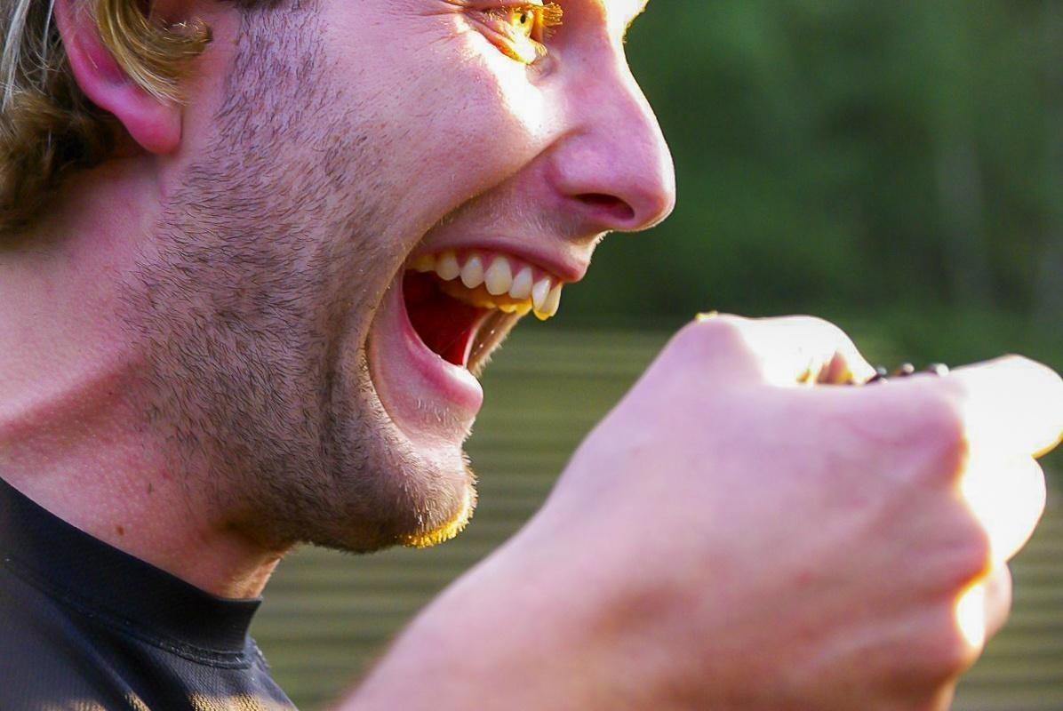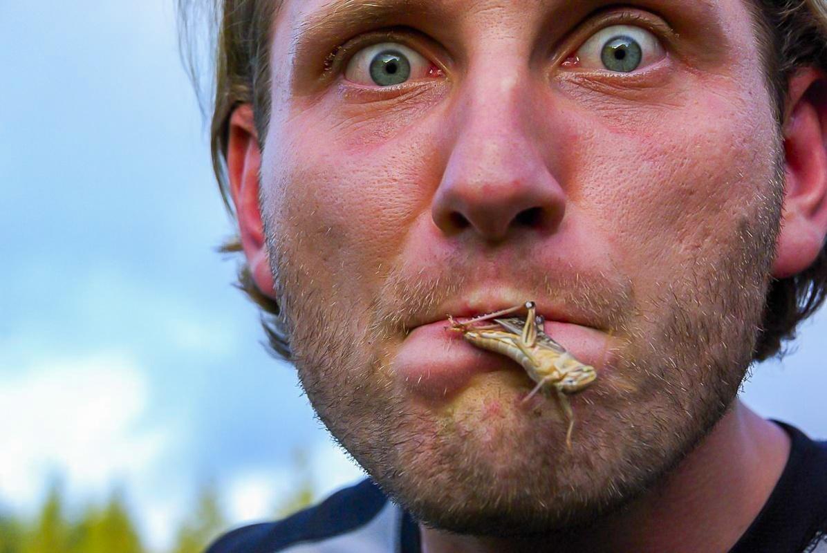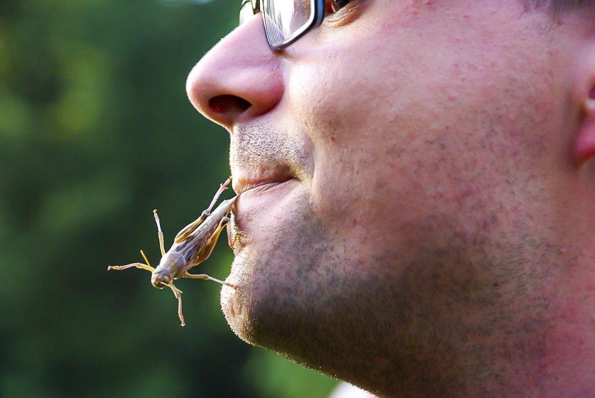 Mann mit Heuschrecke im Mund und überraschter Mimik