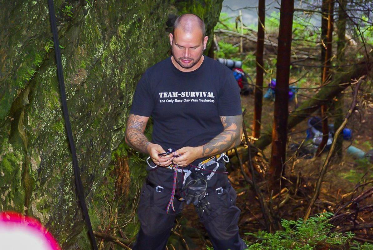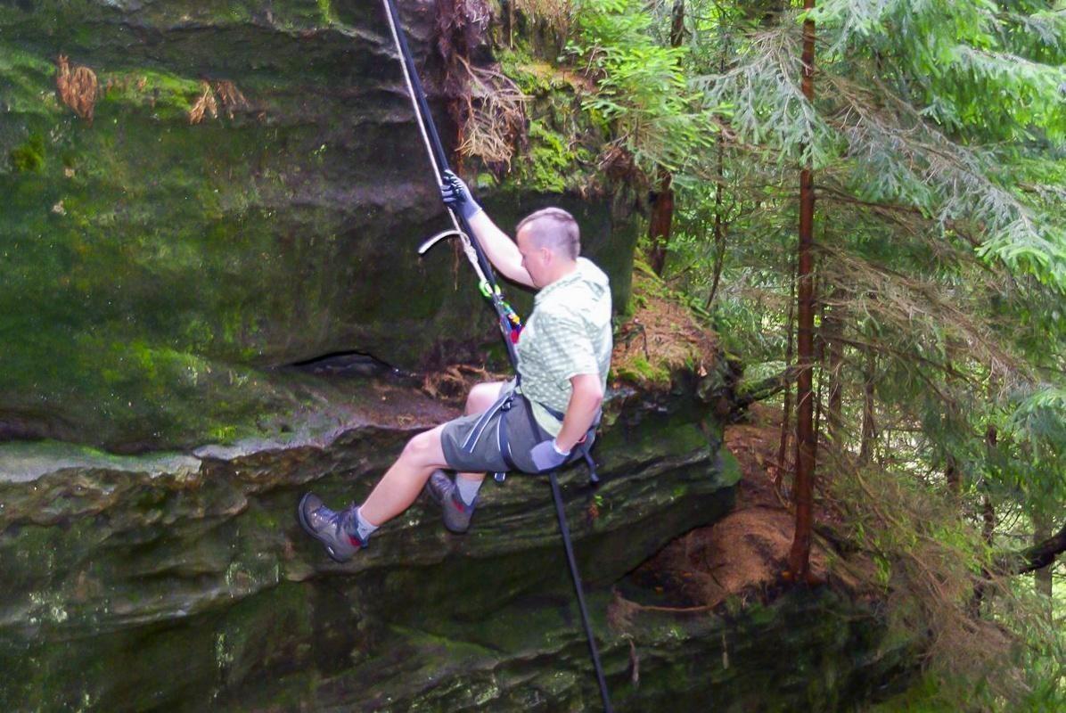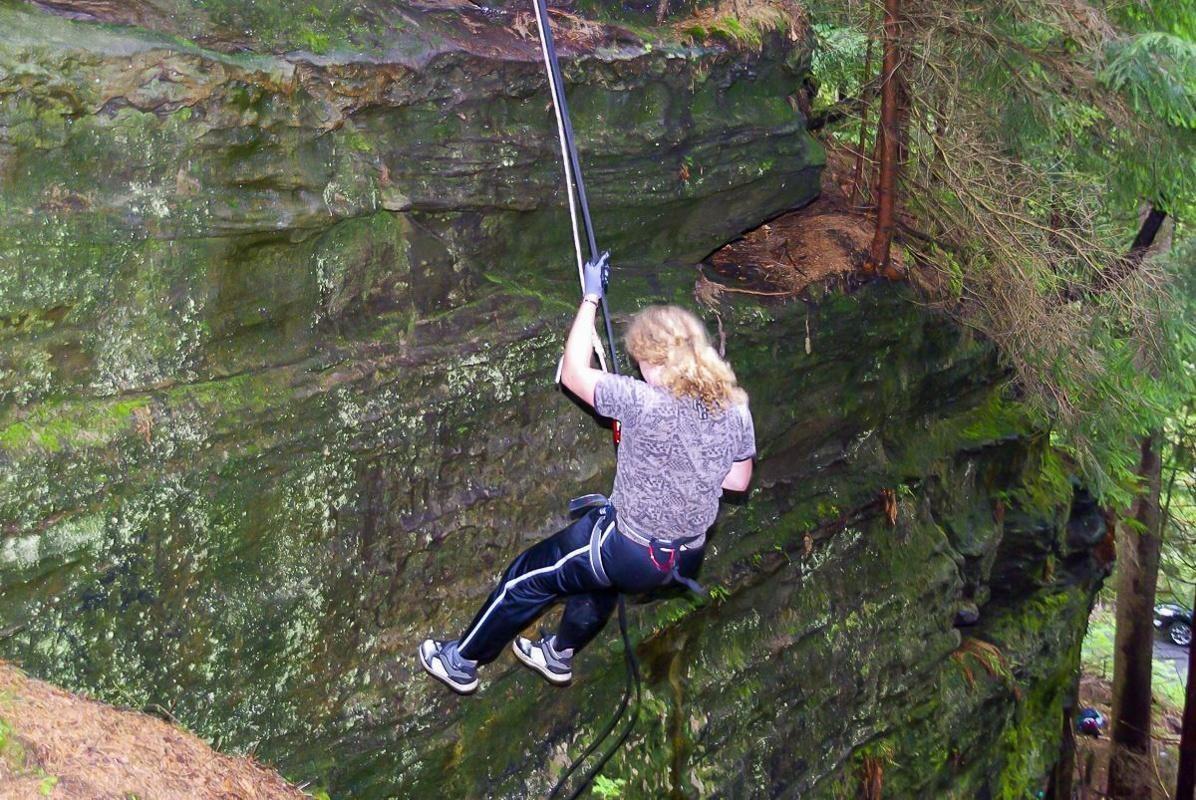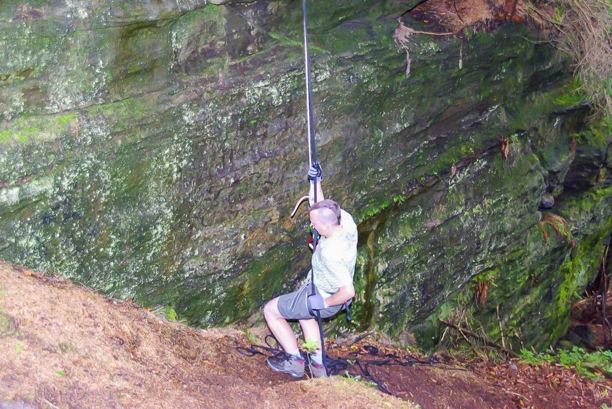 Abseilen an einem Felsvorsprung mit Seil und Karabiner im Wald