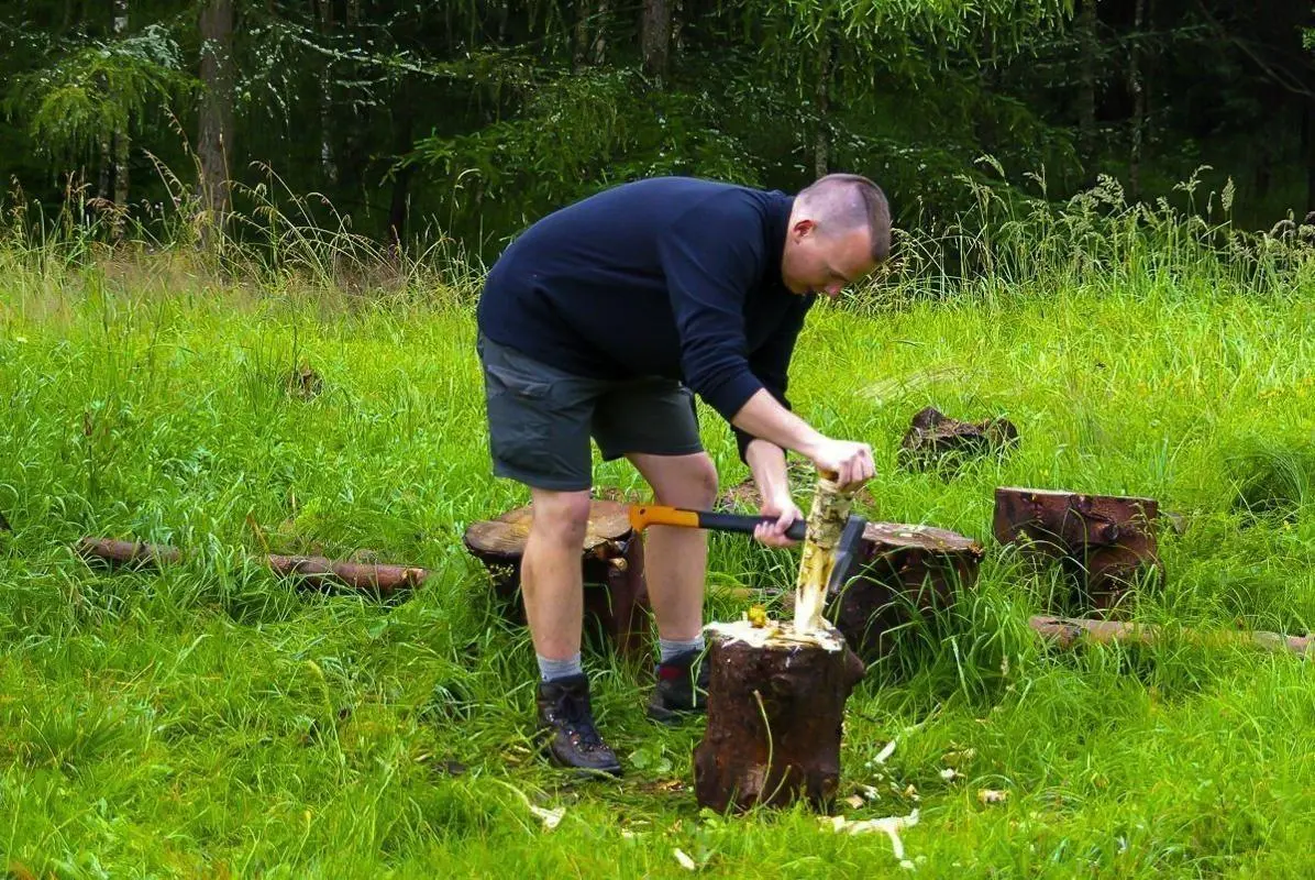 Mann bearbeitet Holzstück mit Axt auf einem Baumstumpf im Gras