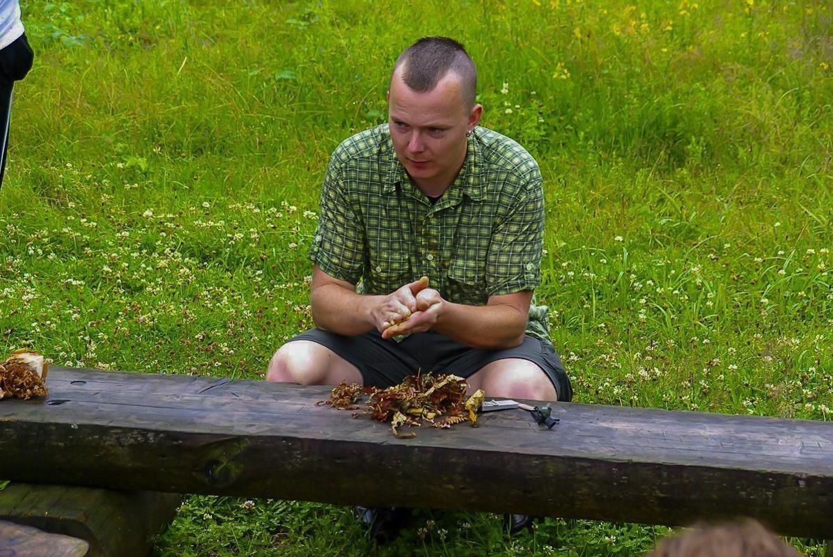 Mann bearbeitet Zunder auf einer Holzbank im Freien