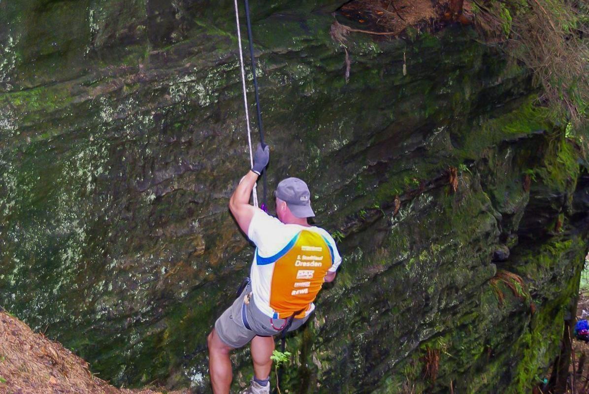 Abseilen an einem Felsvorsprung mit Seil und Sicherungsgurt