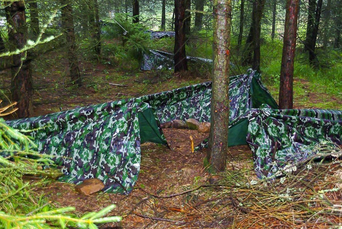 Tarp-Notunterkunft aus Camouflage-Material zwischen Bäumen im Wald
