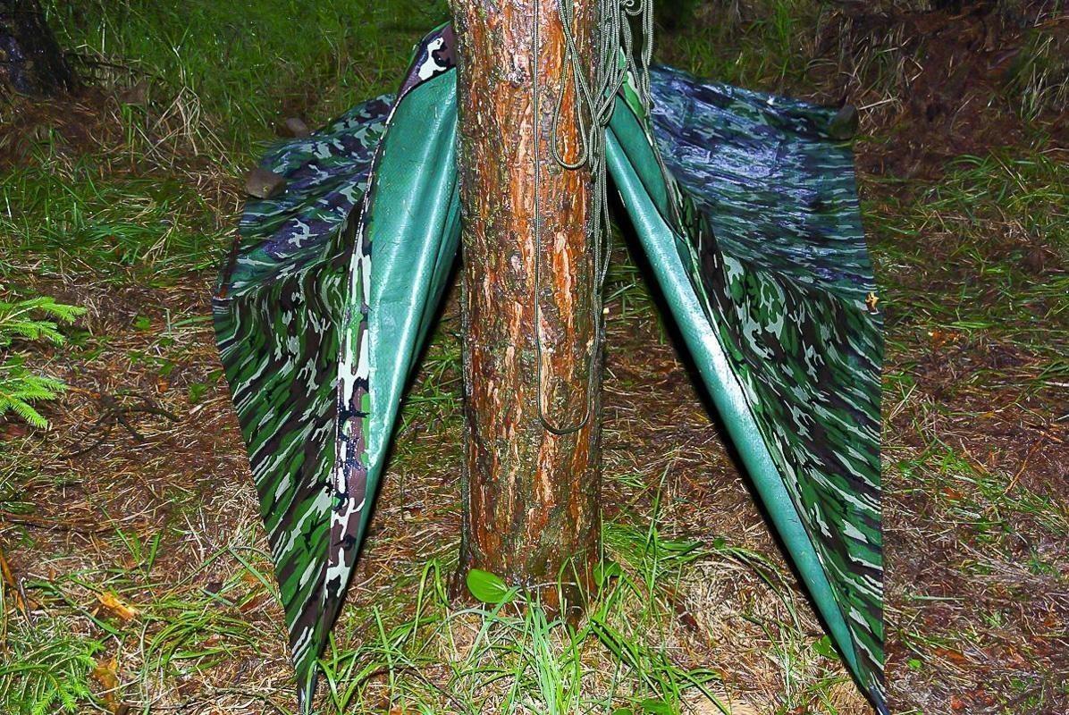 Tarp-Notunterkunft ist zwischen zwei Bäumen aufgespannt