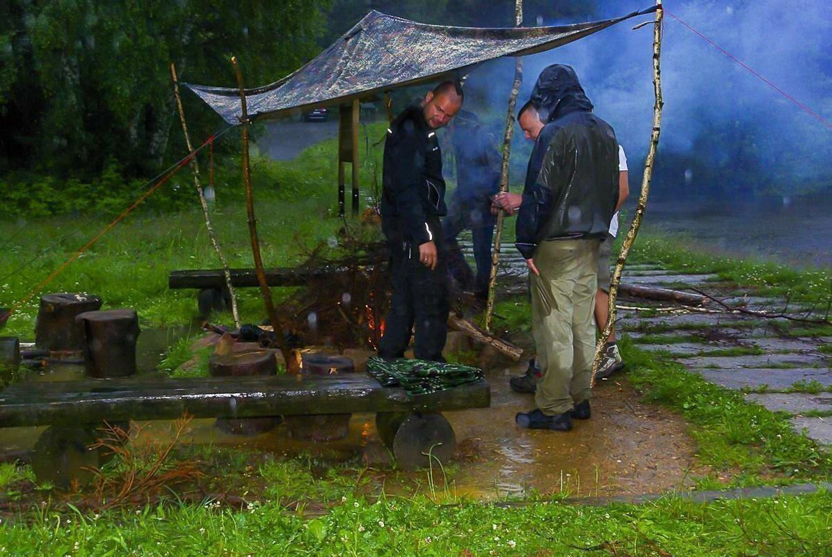 Männer stehen unter einem Tarp und bereiten ein kleines Bodenfeuer vor