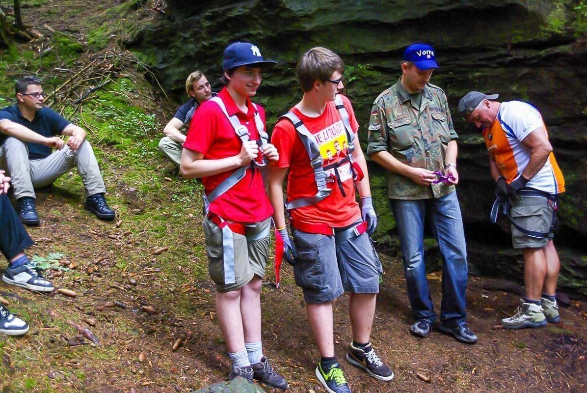 Zwei Jugendliche mit Klettergurten stehen in einem Wald, während andere Personen im Hintergrund sitzen