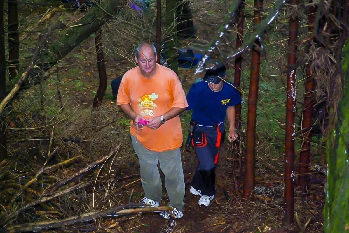 Zwei Personen bewegen sich durch einen bewaldeten Bereich mit umgestürzten Ästen