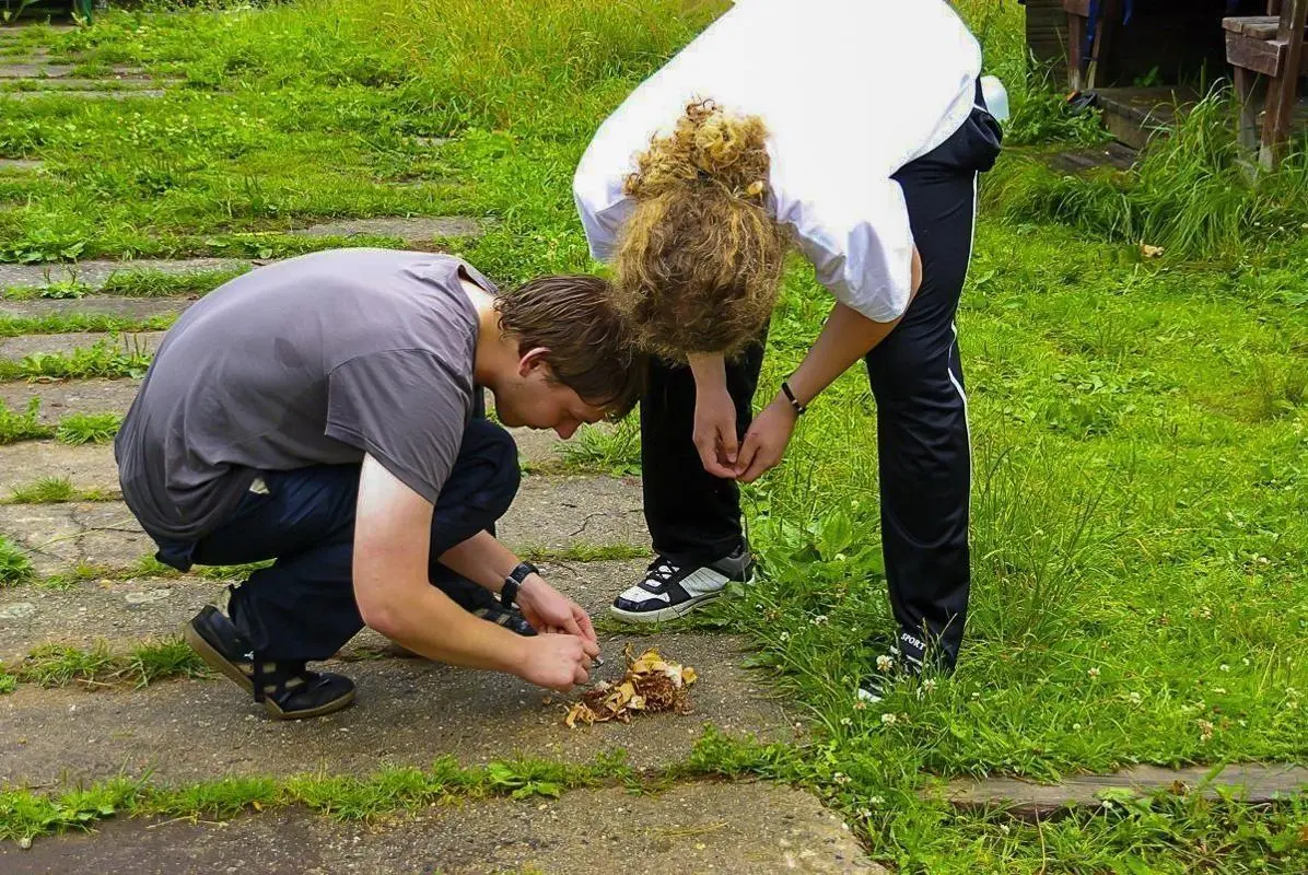 Zwei Personen sammeln Zunder auf einem gepflasterten Weg im Freien