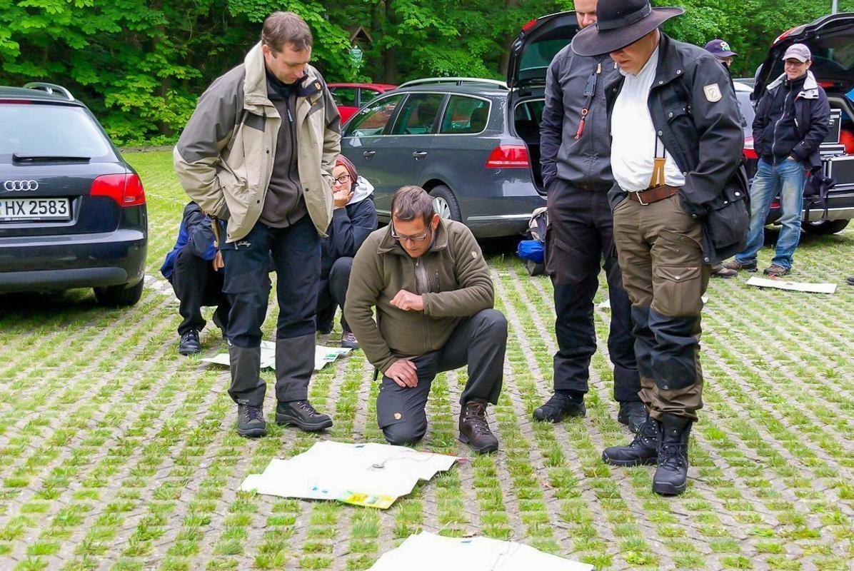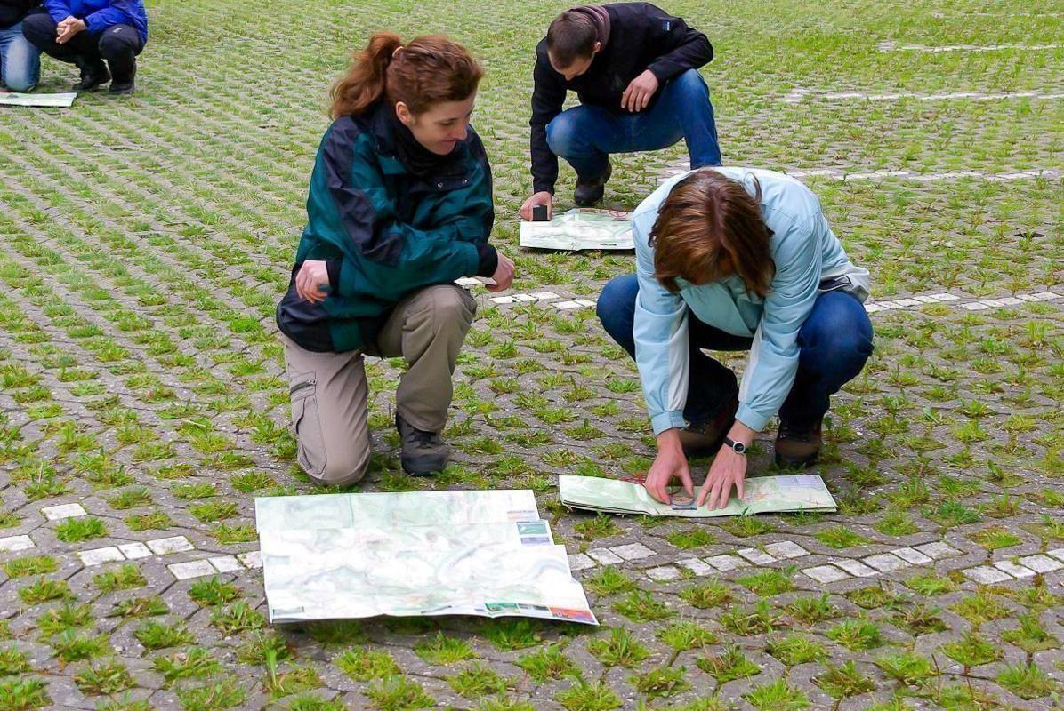 Gruppendiskussion über Kartenmaterial auf dem Boden im Freien
