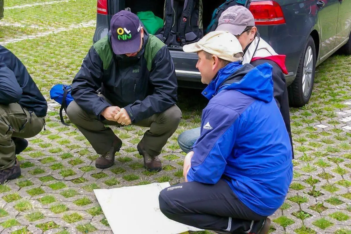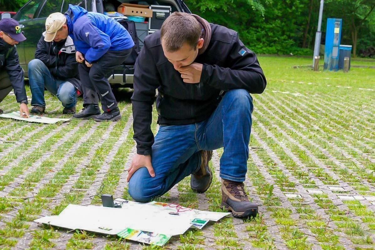 Drei Personen knien um eine Karte auf dem Boden, während ein Auto im Hintergrund steht