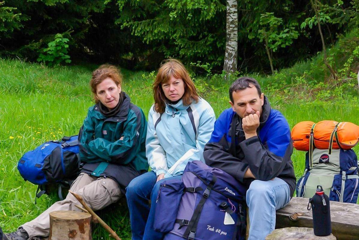 Drei Personen sitzen auf einem Baumstamm, Rucksäcke liegen neben ihnen