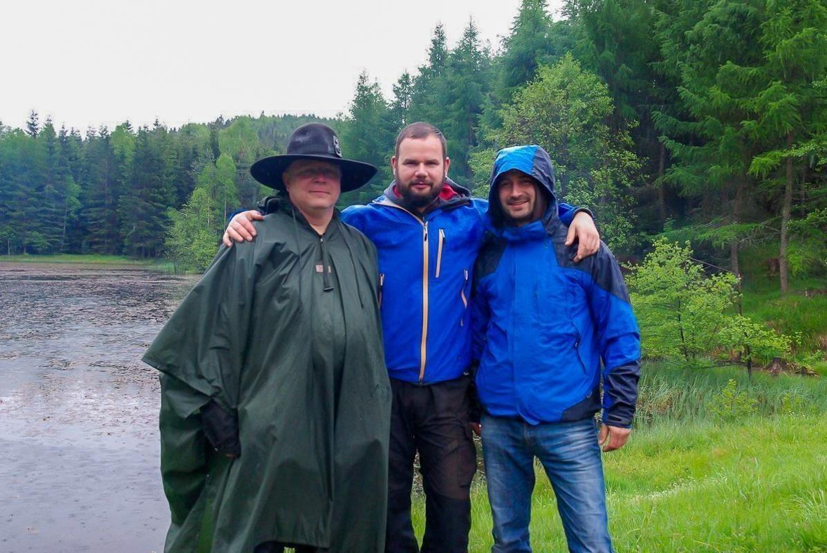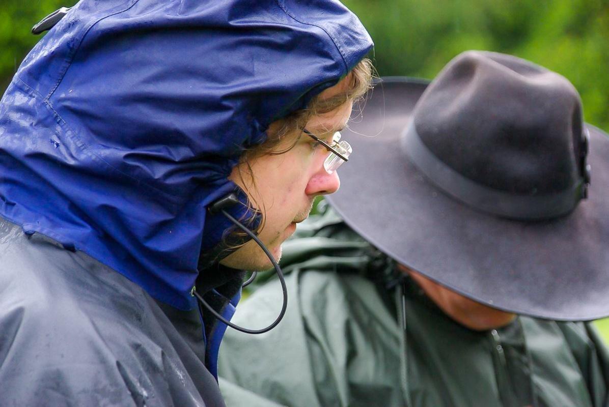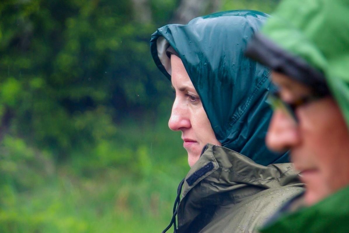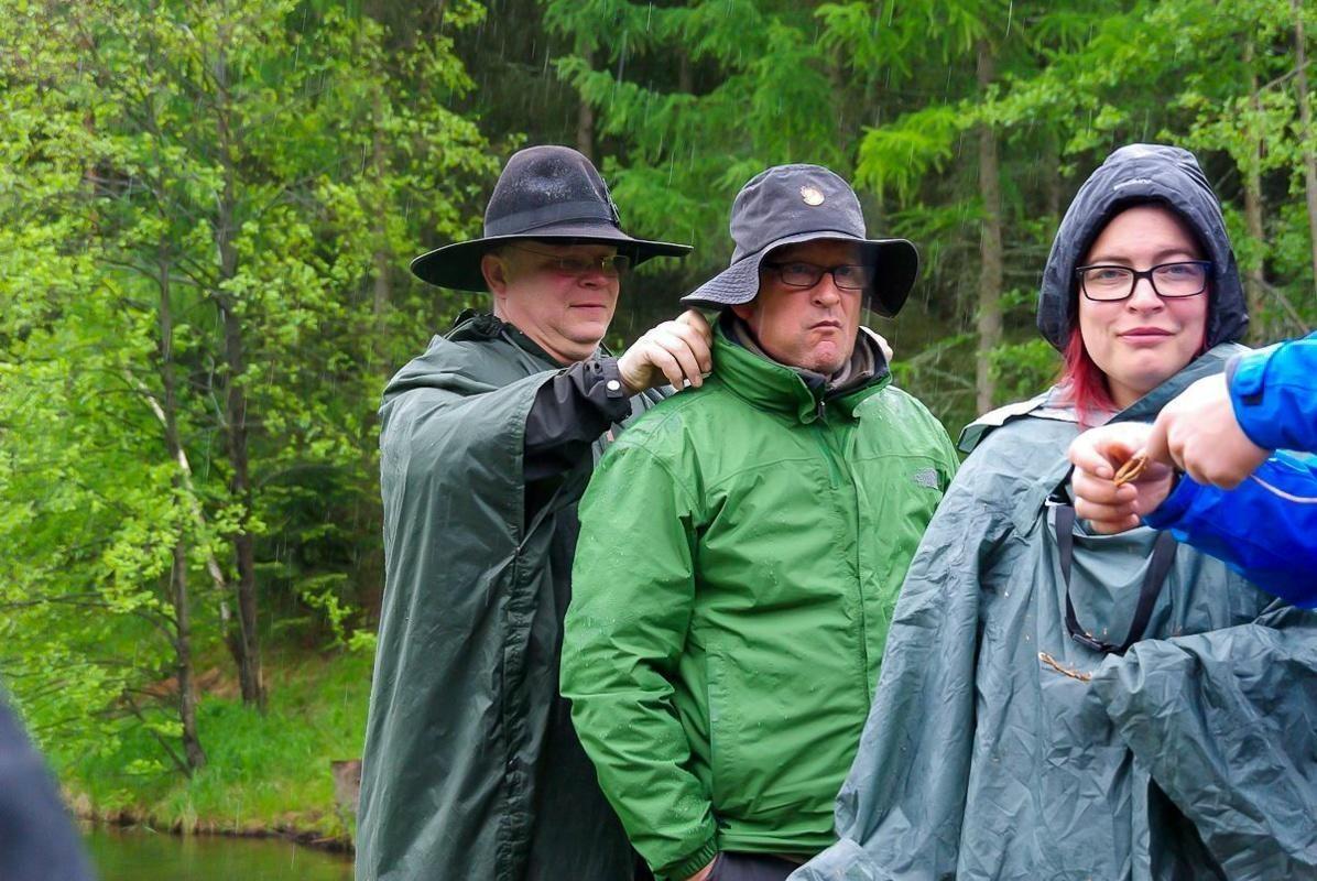 Drei Personen tragen Regenjacken und stehen in einer grünen Umgebung