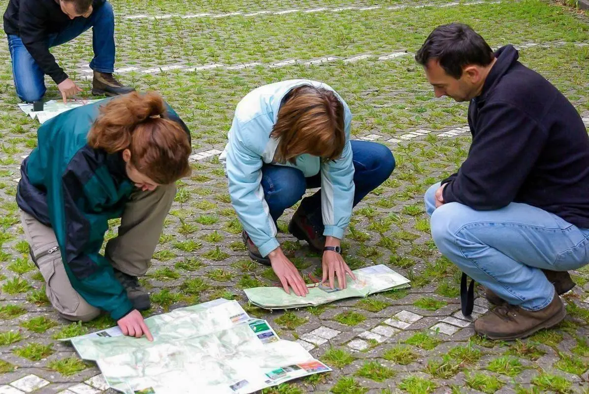 Drei Personen studieren Karten auf dem Boden in einer gepflasterten Umgebung