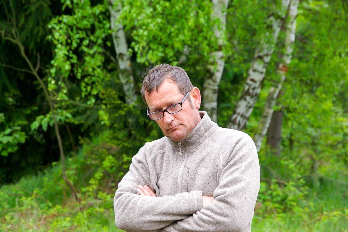 Mann mit verschränkten Armen steht in einer grünen Umgebung