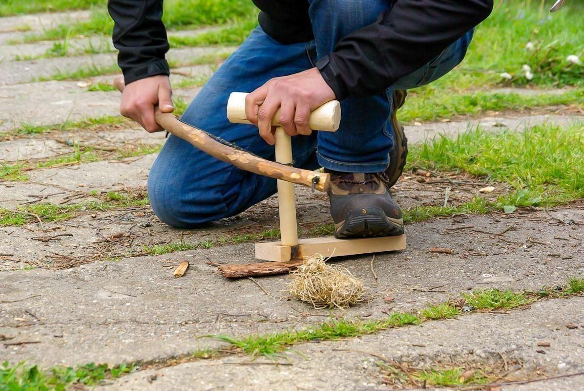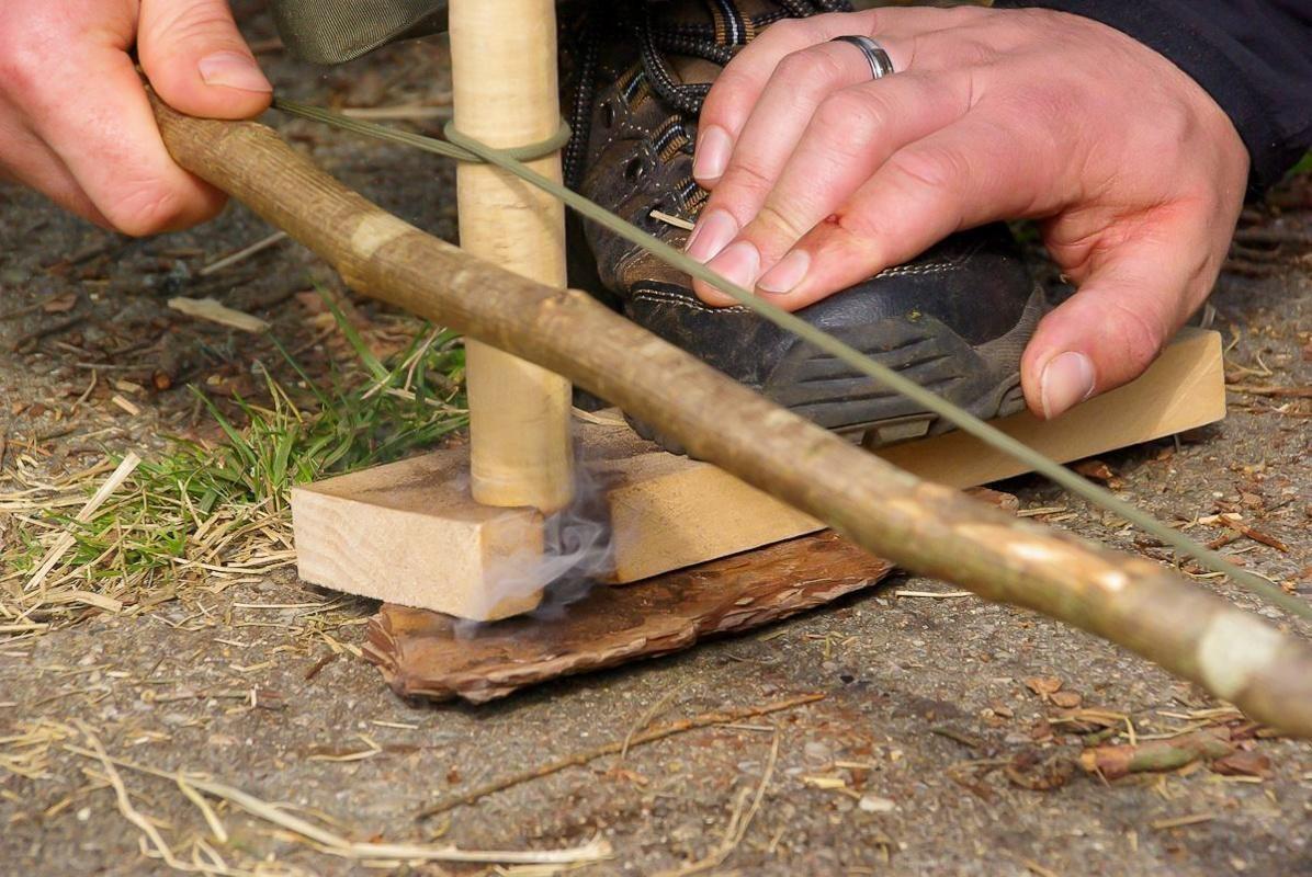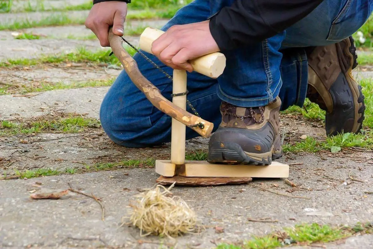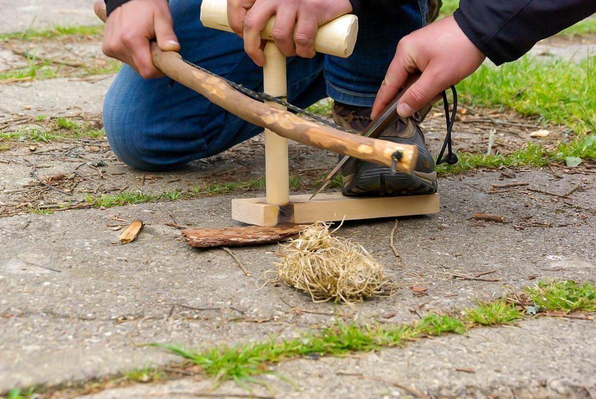 Mann nutzt eine Feuerbohrmaschine, um Zunder zu entzünden