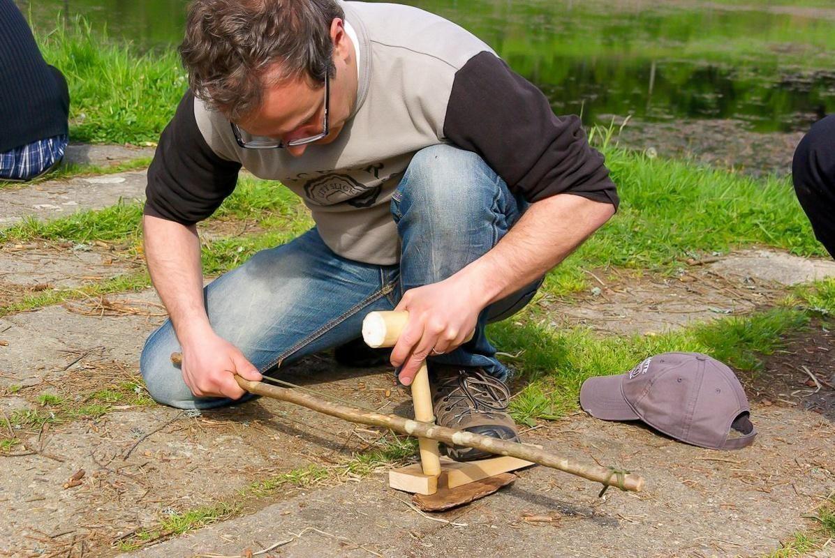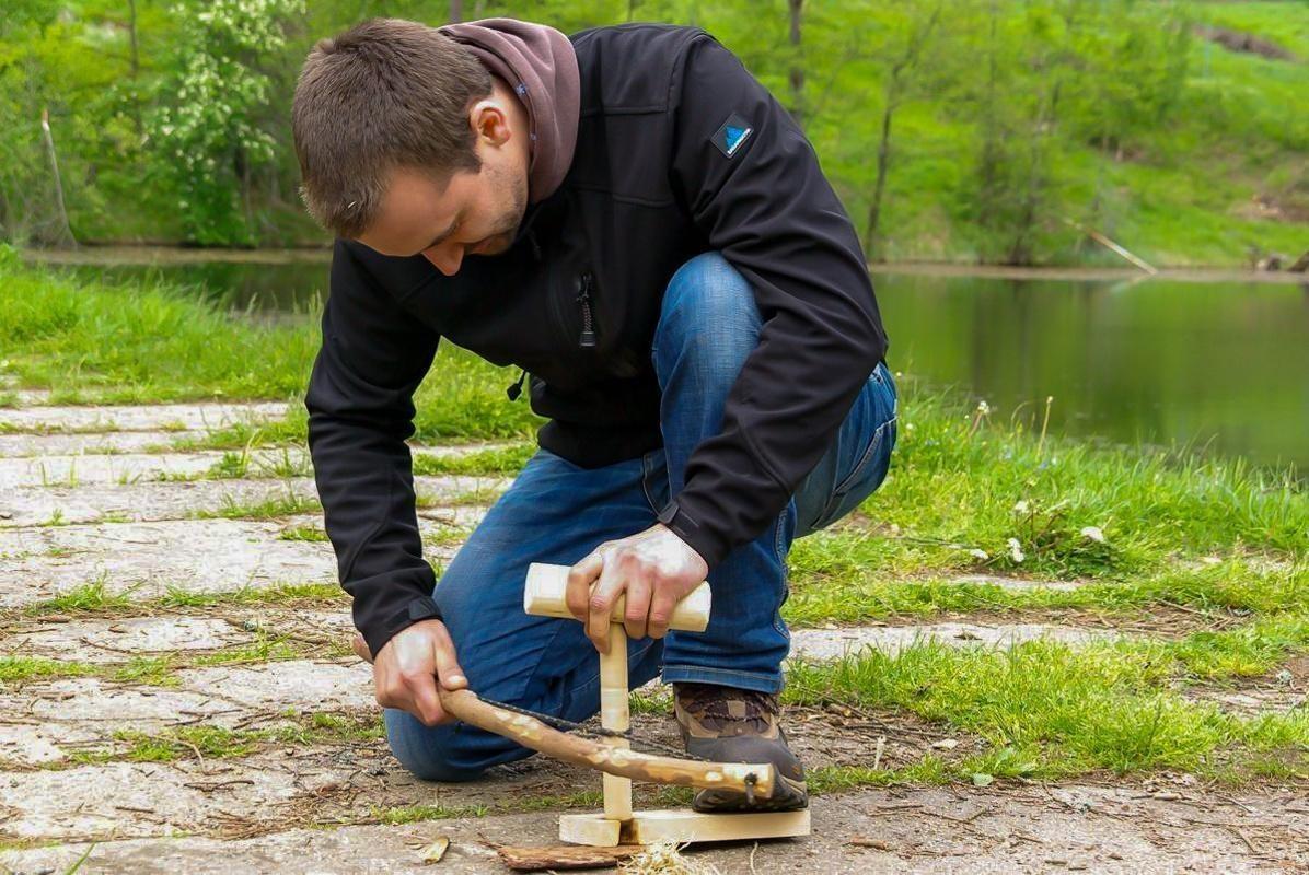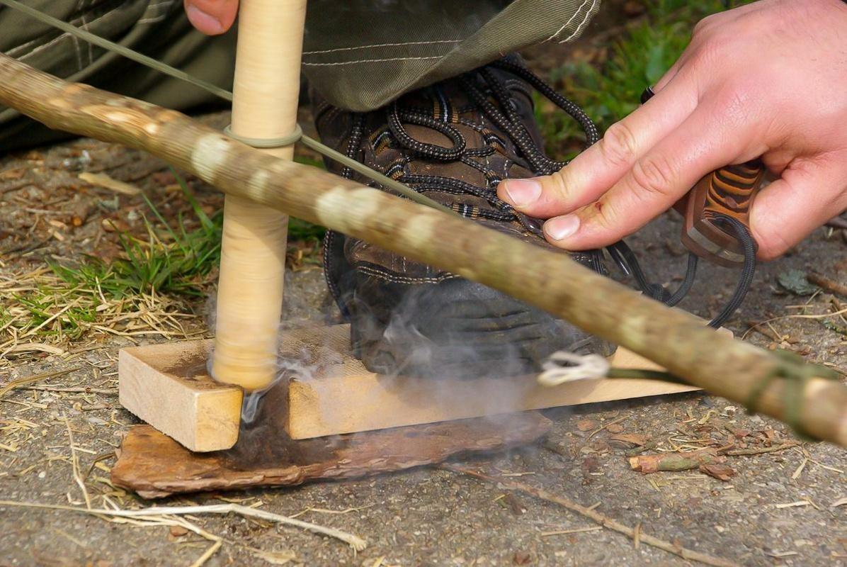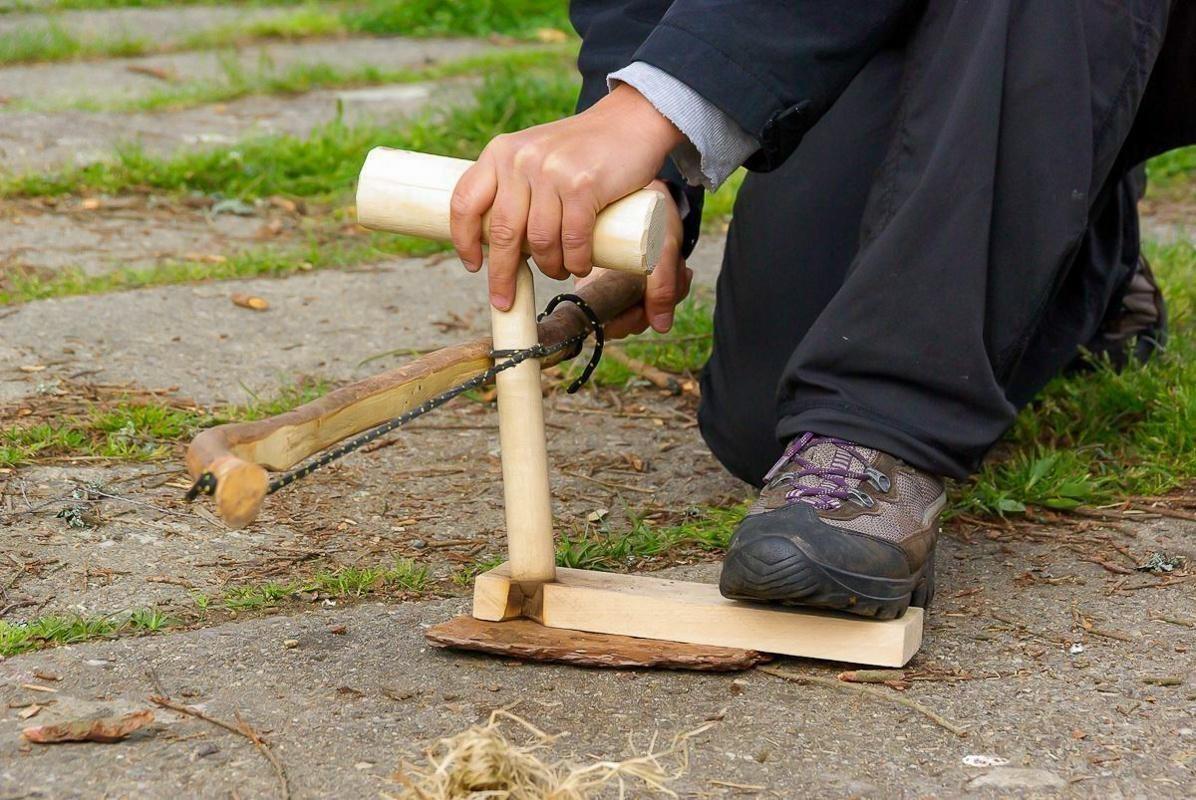 Mann nutzt eine Feuerbohrmaschine, um Zunder zu entzünden
